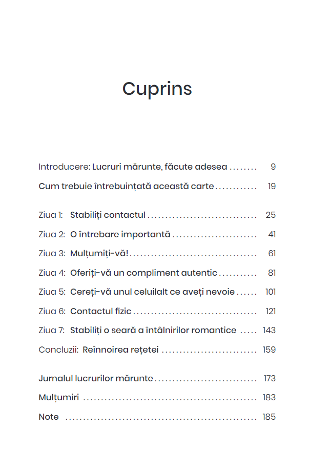 De-a lungul a șapte zile, veți învăța să vă dozați eficient grija și afecțiunea și să renunțați la tot ce dăunează sănătății cuplului: critica, disprețul, atitudinea defensivă și refuzul comunicării.