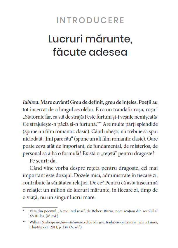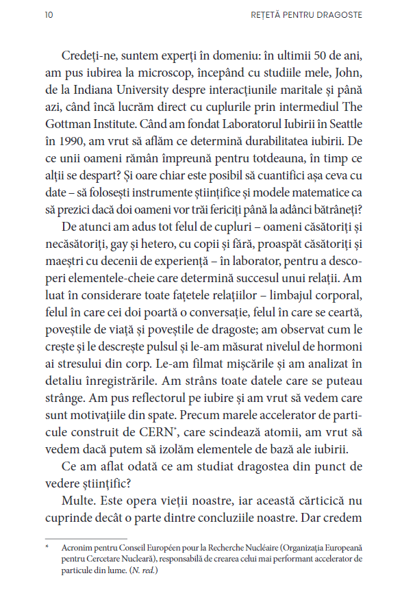 Având la bază o solidă cercetare științifică, rețeta iubirii propusă de soții Gottman explică pas cu pas care sunt ingredientele necesare și pașii indispensabili pentru dezvoltarea unei relații de durată.