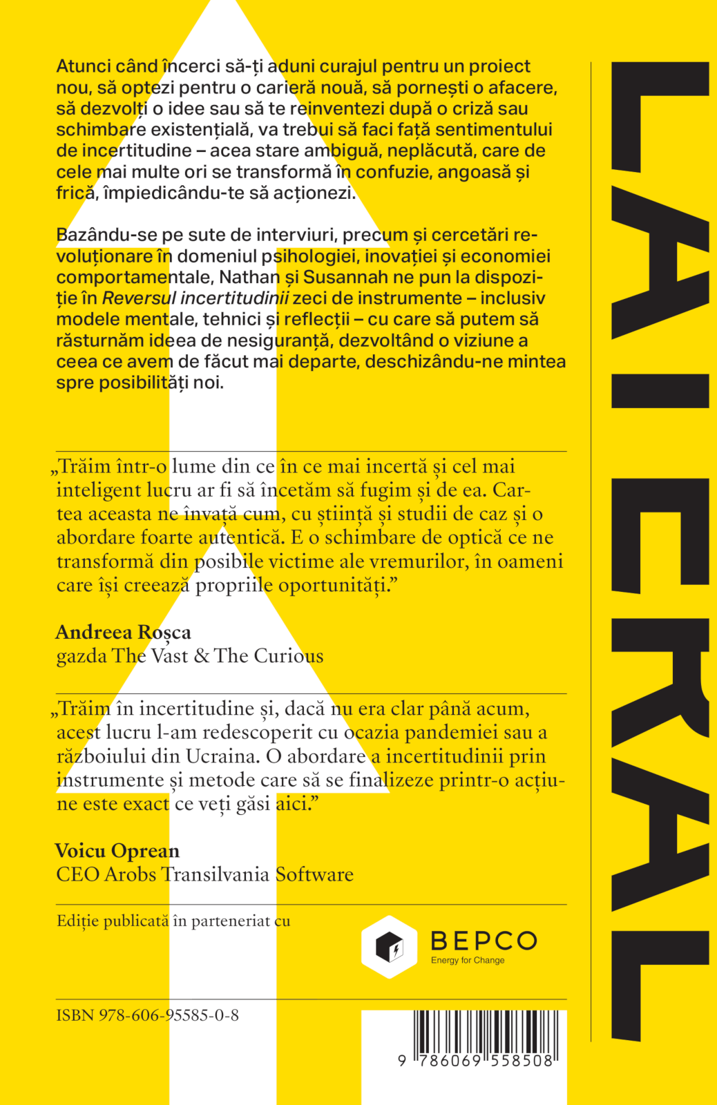 Bazându-se pe sute de interviuri, precum și cercetări revoluționare în domeniul psihologiei, inovației și economiei comportamentale, Nathan și Susannah ne pun la dispoziție în Reversul incertitudinii zeci de instrumente – inclusiv modele mentale, tehnici și reflecții – cu care să putem să răsturnăm ideea de nesiguranță, dezvoltând o viziune a ceea ce avem de făcut mai departe, deschizându-ne mintea spre posibilități noi.