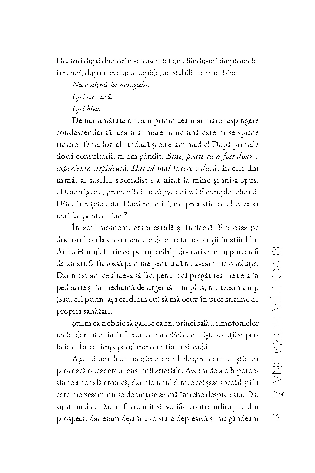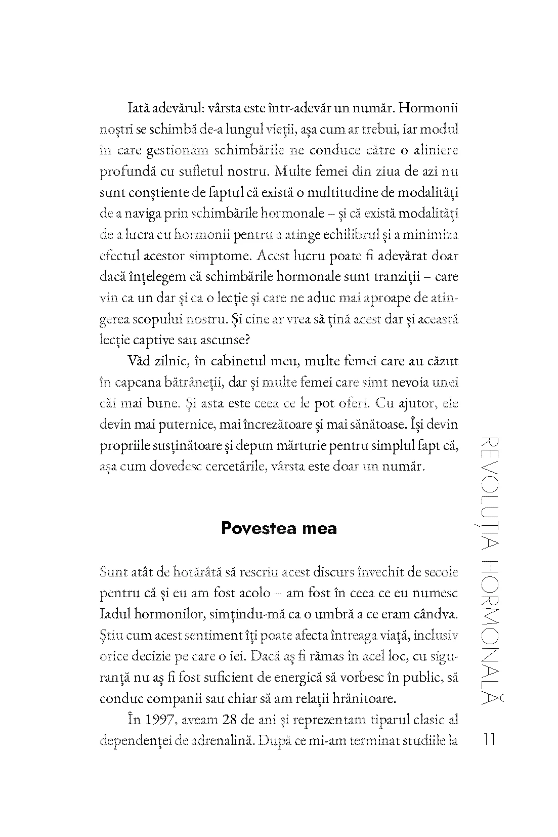Departe de clișeul conform căruia menopauza ar marca „sfârșitul feminității”, autoarea arată că fiecare vârstă are propriul ritm hormonal și propriul limbaj corporal. Ea vine în ajutorul femeilor cu un plan practic, numit „Resetarea hormonală în 30 de zile”, bazat pe alimentație, somn, gestionarea stresului și reconectarea cu sine.