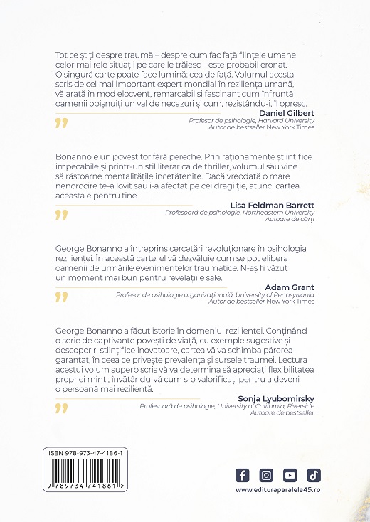 „Tot ce știți despre traumă – despre cum fac față ființele umane celor mai rele situații pe care le trăiesc – este probabil eronat. O singură carte poate face lumină: cea de față. Volumul acesta, scris de cel mai important expert mondial în reziliența umană, vă arată în mod elocvent, remarcabil și fascinant cum înfruntă oamenii obișnuiți un val de necazuri și cum, rezistându-i, îl opresc.”