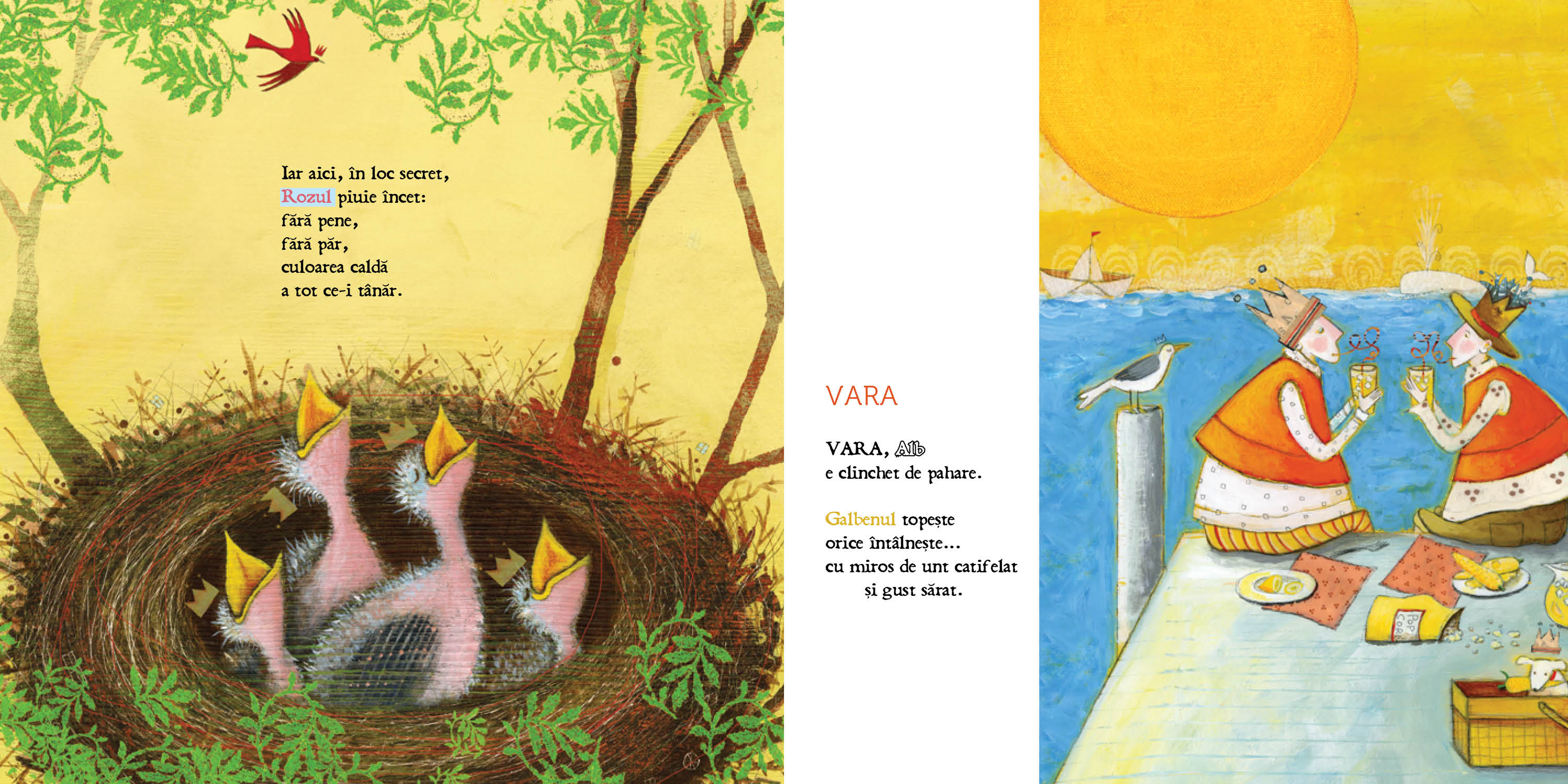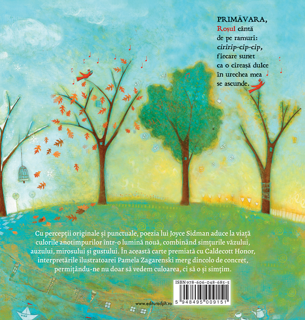 Roșul cântă de pe ramuri – un an în culori este o carte de poezii pentru copii; fiecare poezie din carte este dedicată unui anotimp specific și oferă o perspectivă poetică asupra modului în care culorile sunt asociate cu diferitele aspecte ale naturii și ale vieții cotidiene pe parcursul anului. Această abordare permite cititorilor să descopere frumusețea și diversitatea fiecărui anotimp și să se conecteze cu natura.