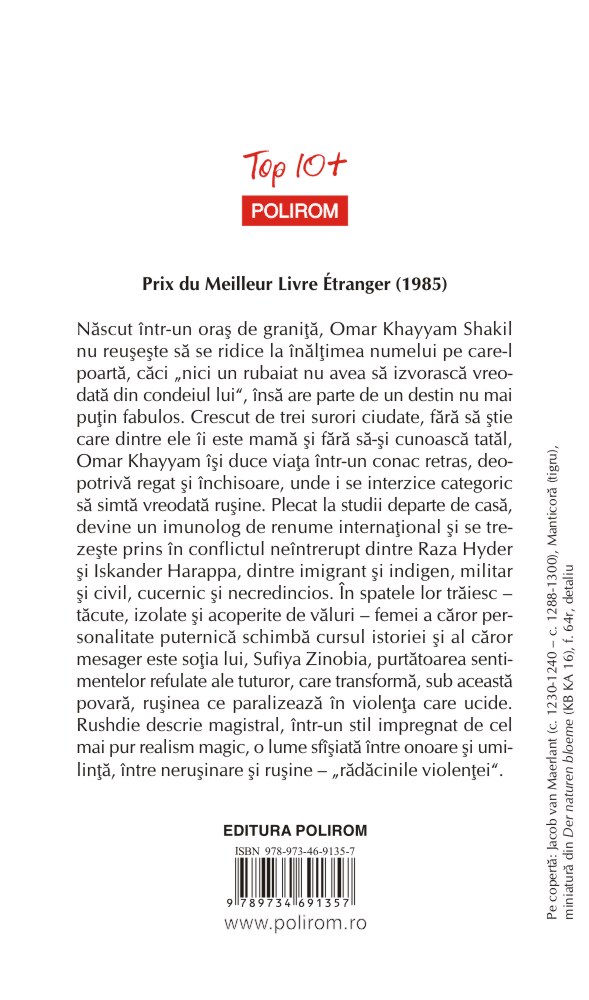 Născut într-un oraş de graniţă, Omar Khayyam Shakil nu reuşeşte să se ridice la înălţimea numelui pe care-l poartă, căci „nici un rubaiat nu avea să izvorască vreodată din condeiul lui”, însă are parte de un destin nu mai puţin fabulos. Crescut de trei surori ciudate, fără să ştie care dintre ele îi este mamă şi fără să-şi cunoască tatăl, Omar Khayyam îşi duce viaţa într-un conac retras, deopotrivă regat şi închisoare, unde i se interzice categoric să simtă vreodată ruşine. Plecat la studii departe de casă, devine un imunolog de renume internaţional şi se trezeşte prins în conflictul neîntrerupt dintre Raza Hyder şi Iskander Harappa, dintre imigrant şi indigen, militar şi civil, cucernic şi necredincios. În spatele lor trăiesc – tăcute, izolate şi acoperite de văluri – femei a căror personalitate puternică schimbă cursul istoriei şi al căror mesager este soţia lui, Sufiya Zinobia, purtătoarea sentimentelor refulate ale tuturor, care transformă, sub această povară, ruşinea ce paralizează în violenţa care ucide. Rushdie descrie magistral, într-un stil impregnat de cel mai pur realism magic, o lume sfîşiată între onoare şi umilinţă, între neruşinare şi ruşine – „rădăcinile violenţei”.