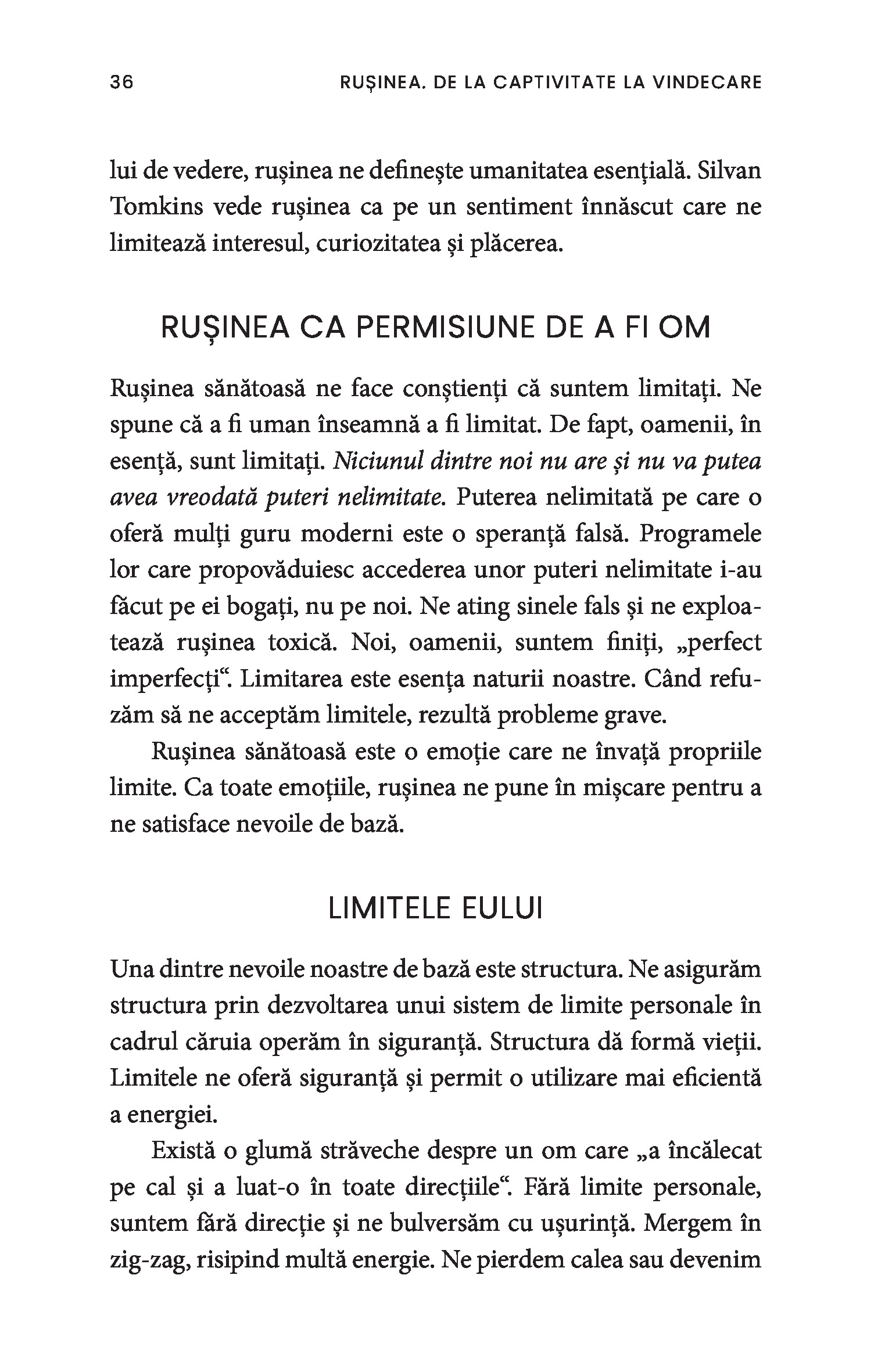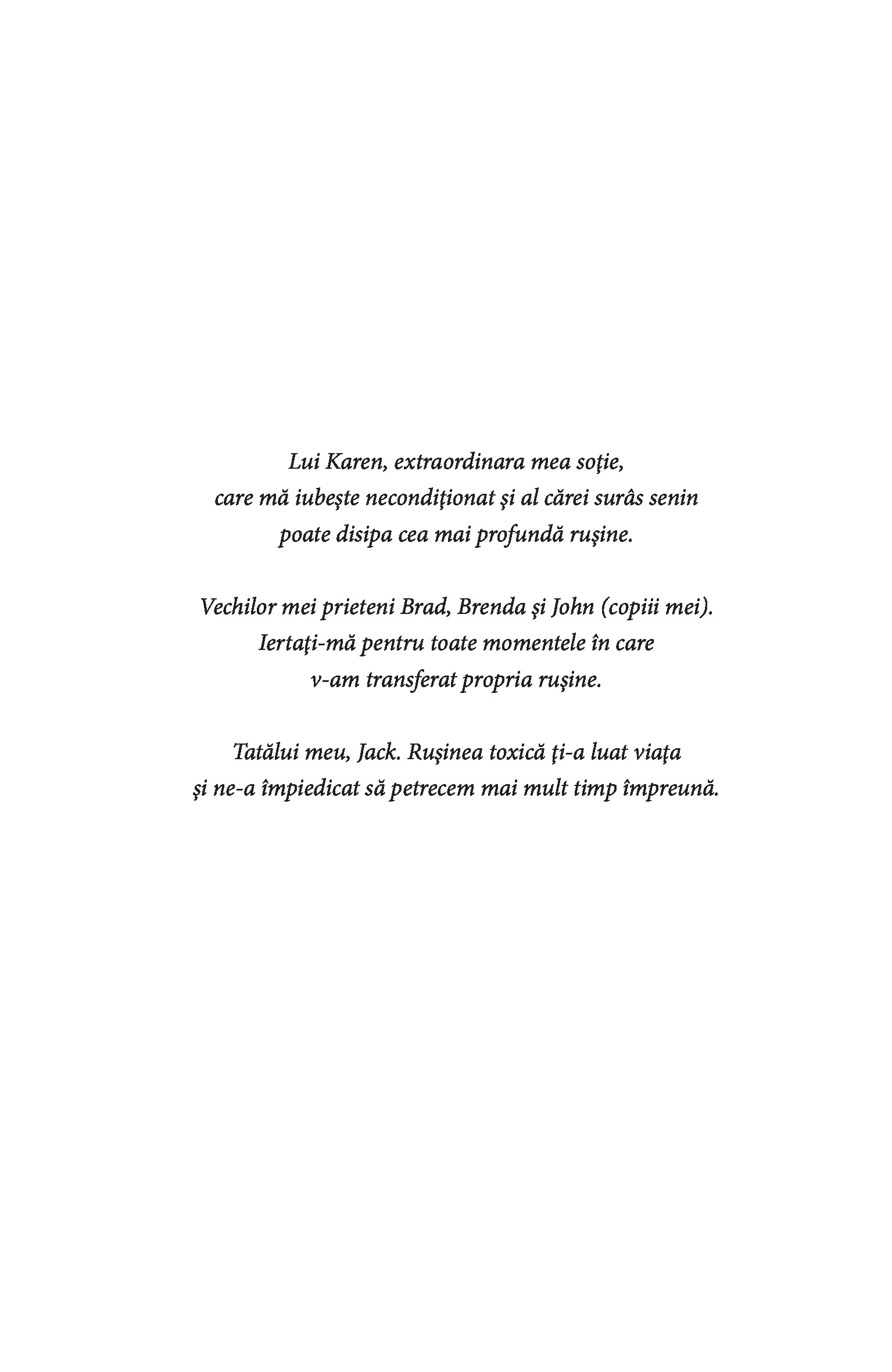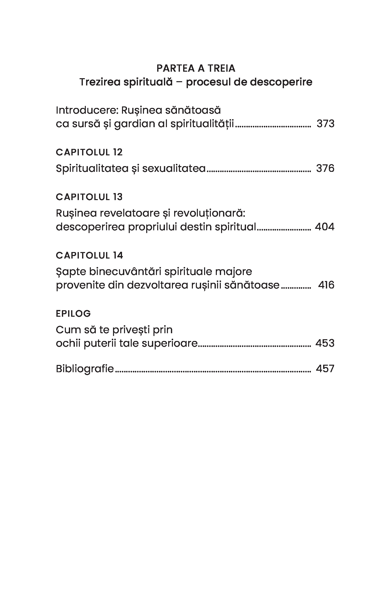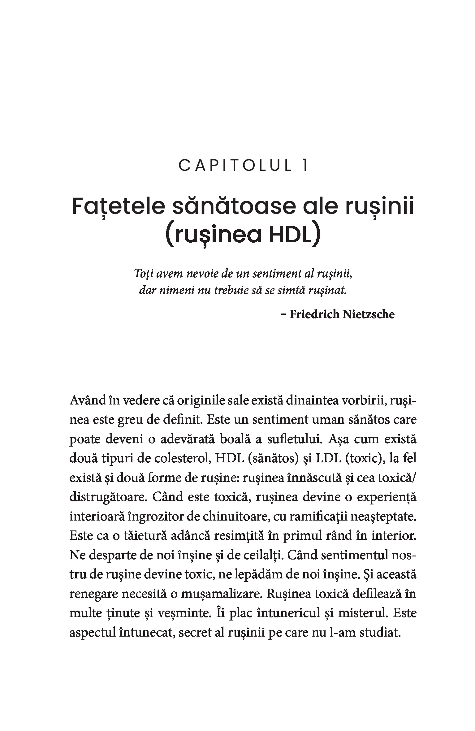 Cu cât aflăm mai mulți secretele întunecate ale acestei emoții distructive, cu atât mai puțină putere și control va avea ea asupra noastră. Rușinea este un ghid minunat atât pentru publicul larg, cât și pentru specialiștii în psihologie, din care aflăm geneza rușinii, felul în care este transmisă la nivel inconștient de către familie și modurile multifațetate prin care îți ruinează viața atunci când nu ești conștient de prezența ei.