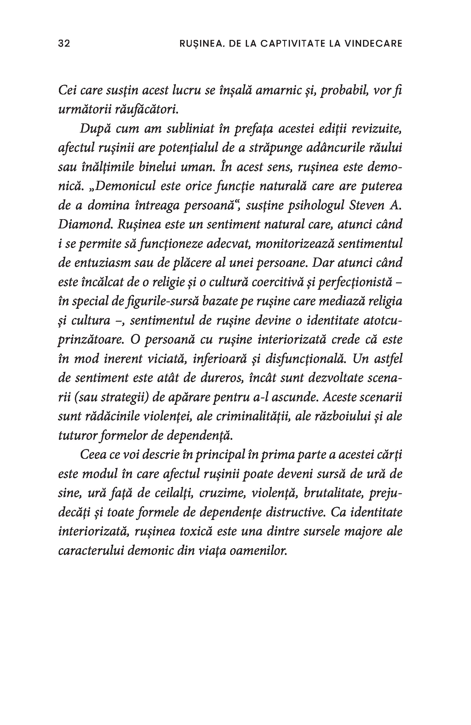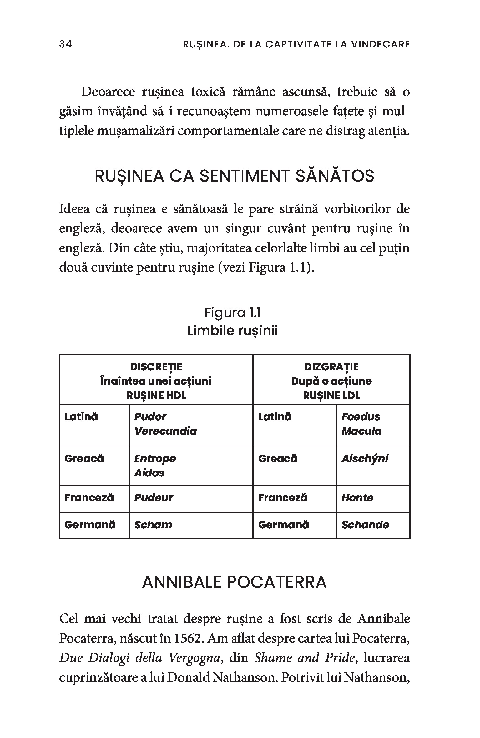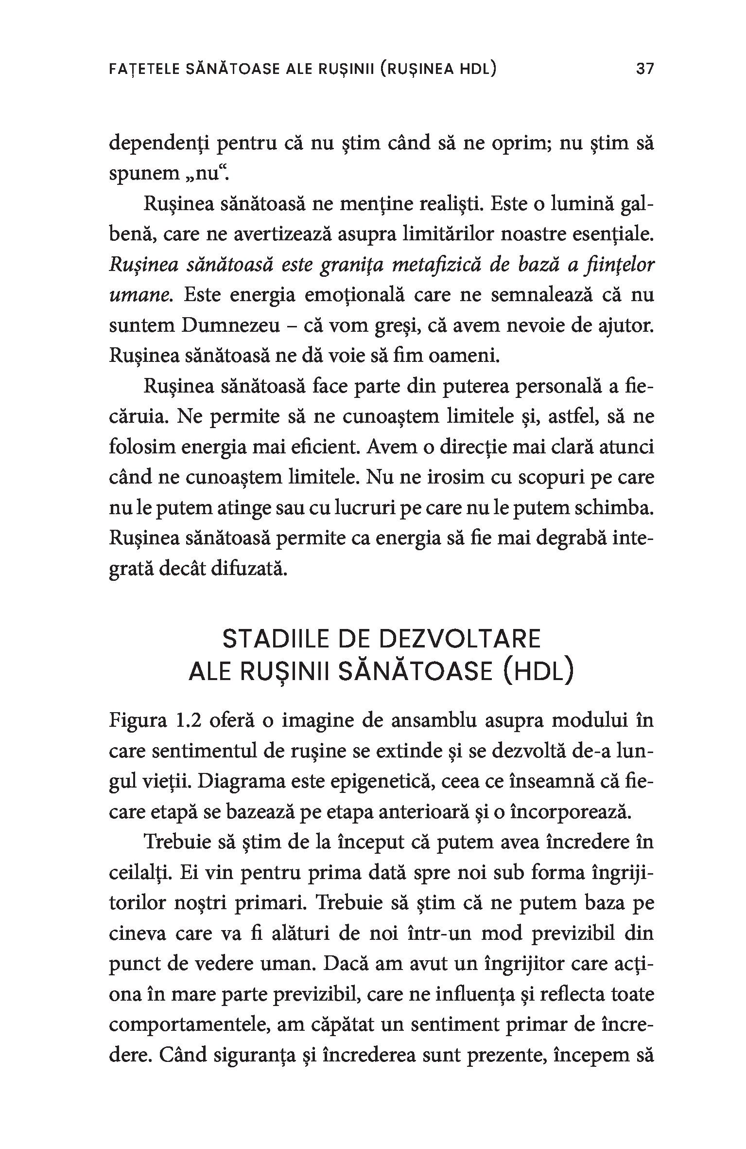 Cu cât aflăm mai mulți secretele întunecate ale acestei emoții distructive, cu atât mai puțină putere și control va avea ea asupra noastră. Rușinea este un ghid minunat atât pentru publicul larg, cât și pentru specialiștii în psihologie, din care aflăm geneza rușinii, felul în care este transmisă la nivel inconștient de către familie și modurile multifațetate prin care îți ruinează viața atunci când nu ești conștient de prezența ei.