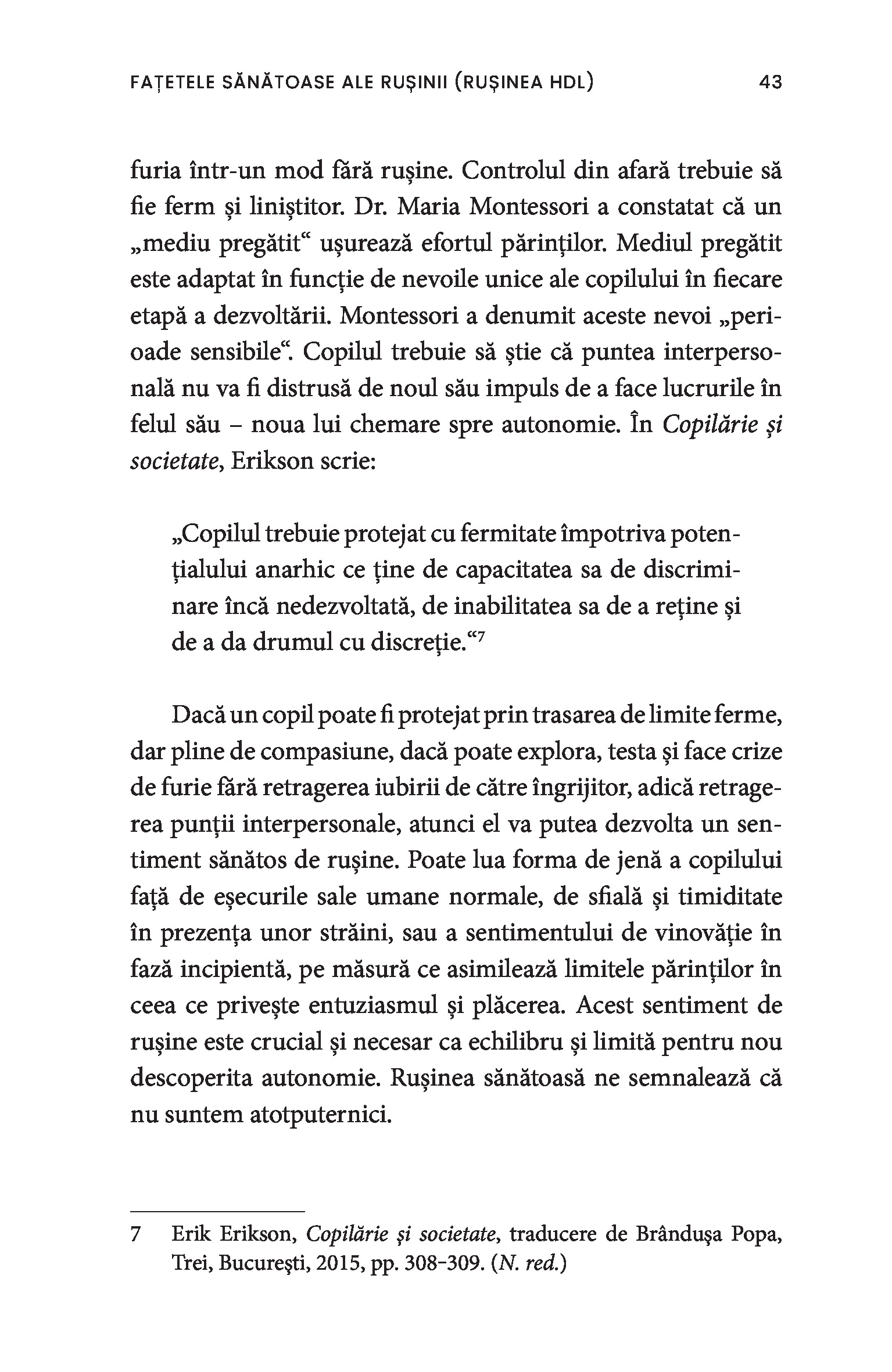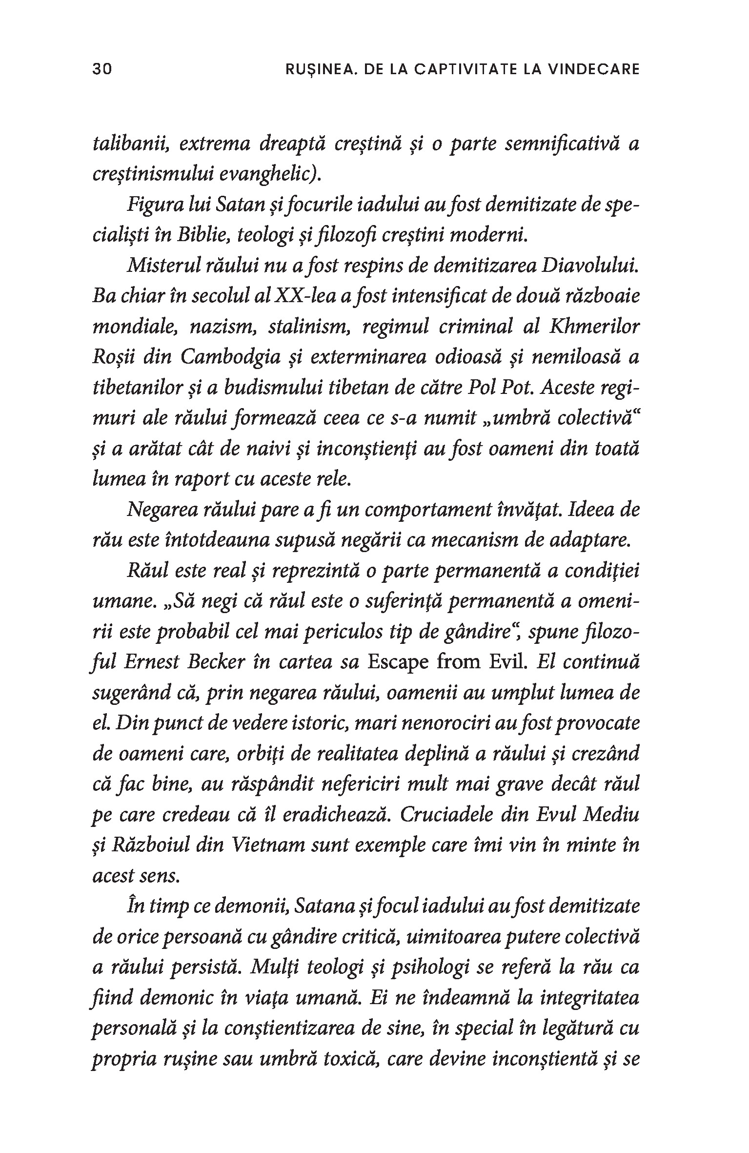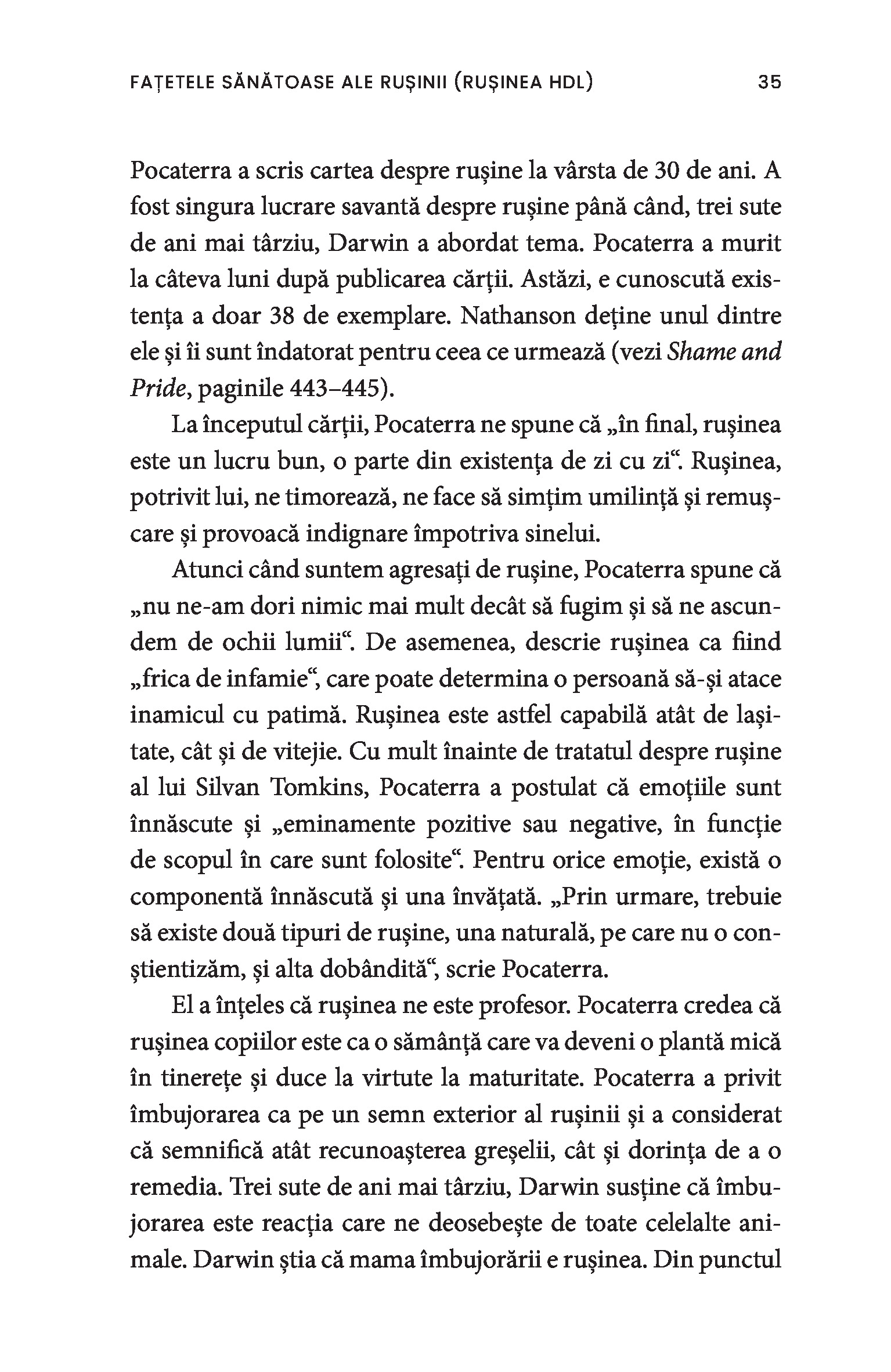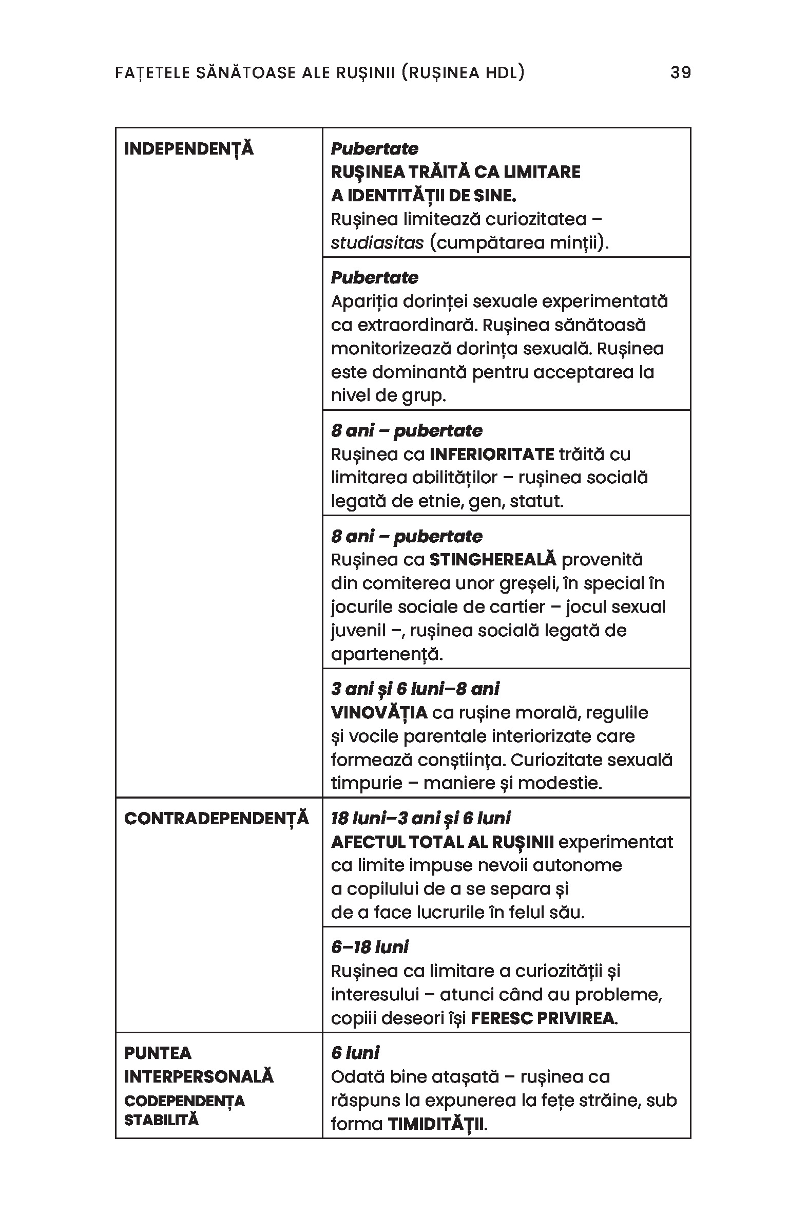 Cu cât aflăm mai mulți secretele întunecate ale acestei emoții distructive, cu atât mai puțină putere și control va avea ea asupra noastră. Rușinea este un ghid minunat atât pentru publicul larg, cât și pentru specialiștii în psihologie, din care aflăm geneza rușinii, felul în care este transmisă la nivel inconștient de către familie și modurile multifațetate prin care îți ruinează viața atunci când nu ești conștient de prezența ei.
