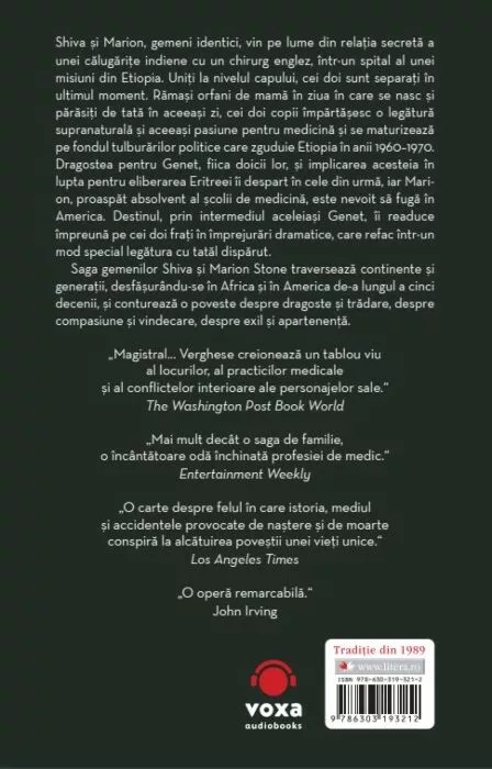 Saga gemenilor Shiva și Marion Stone traversează continente și generații, desfășurându-se în Africa și în America de-a lungul a cinci decenii, și conturează o poveste despre dragoste și trădare, despre compasiune și vindecare, despre exil și apartenență.