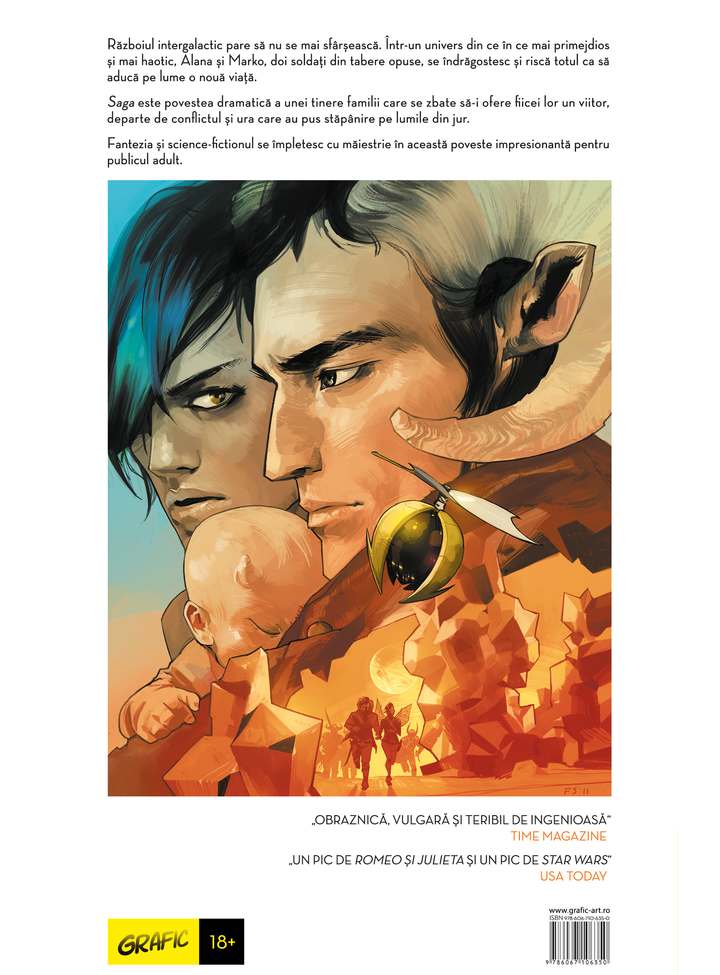 Saga este povestea dramatică a unei tinere familii care se zbate să-i ofere fiicei lor un viitor, departe de conflictul și ura care au pus stăpânire pe lumile din jur.
