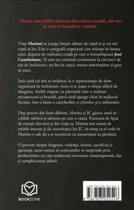 Însă atunci când Marina îl întâlnește și îl ascultă citindu-și textele la atelierul de lectură al închisorii, se îndrăgostește de el fulgerător. Povestea lui José Cuauhtémoc este mai tulburătoare și mai întunecată decât ar fi putut bănui vreodată, iar iubirea lor este flacăra care va sfârși prin a arde din temelii tot ceea ce credea că știe despre lume.