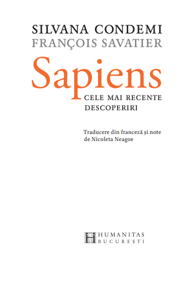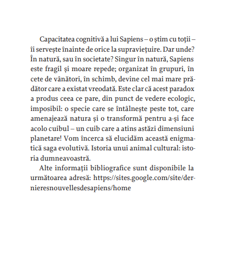 „Capacitatea cognitivă a lui Sapiens – o ştim cu toţii – îi serveşte înainte de orice la supravieţuire. Dar unde? În natură, sau în societate? Singur în natură, Sapiens este fragil şi moare repede; organizat în grupuri, în cete de vânători, în schimb, devine cel mai mare prădător care a existat vreodată. [...] Vom încerca să elucidăm această enigmatică saga evolutivă. Istoria unui animal cultural: istoria dumneavoastră.“ — SILVANA CONDEMI, FRANÇOIS SAVATIER