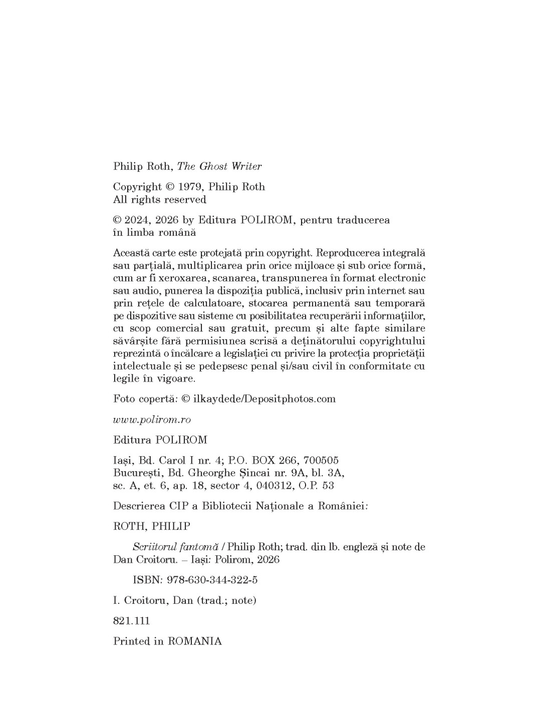 Philip ROTH s‑a născut în Newark, New Jersey, în 19 martie 1933. Al doilea copil al unui cuplu de americani din a doua generaţie, Bess şi Herman Roth, Philip Roth a crescut în marea comunitate evreiască din Weequahic, cartier la care avea să revină în scrierile lui. După absolvirea liceului Weequahic în 1950, a studiat la Bucknell University din Pennsylvania şi la University of Chicago, unde a primit o bursă pentru a‑şi definitiva masterul în literatură engleză. În 1959 a publicat La revedere, Columbus – o selecţie de povestiri şi o nuvelă –, pentru care a primit National Book Award. Zece ani mai tîrziu, publicarea celui de‑al patrulea roman al său, Complexul lui Portnoy, i‑a adus lui Roth aprecierea criticii şi succesul comercial, consolidîndu‑i poziţia printre cei mai buni scriitori tineri americani. Roth este autorul a treizeci şi una de cărţi, printre ele numărîndu‑se şi cele care urmăresc destinul lui Nathan Zuckerman şi pe al unui narator imaginar pe nume Philip Roth, prin care scriitorul a explorat şi a dat glas complexităţii vieţii americane în secolele XX şi XXI. Contribuţia durabilă a lui Roth la literatură a fost larg recunoscută de‑a lungul vieţii sale, nu doar în America, ci şi în străinătate. Printre alte distincţii, a primit Pulitzer Prize, International Man Booker Prize, a fost de două ori cîştigător al National Book Critics Circle Award şi National Book Award şi i‑au fost conferite distincţiile National Medal of Arts şi National Humanities de preşedinţii Clinton şi Obama. Philip Roth a murit în 22 mai 2018, la vîrsta de optzeci şi cinci de ani, la şase ani după ce renunţase la scris.