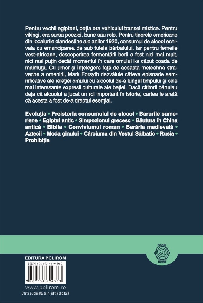 Cu umor și înțelegere față de această meteahnă străveche a omenirii, Mark Forsyth dezvăluie câteva episoade semnificative ale relației omului cu alcoolul de-a lungul timpului și cele mai interesante expresii culturale ale beției. Dacă cititorii bănuiau deja că alcoolul a jucat un rol important în istorie, cartea le arată că acesta a fost de-a dreptul esențial.