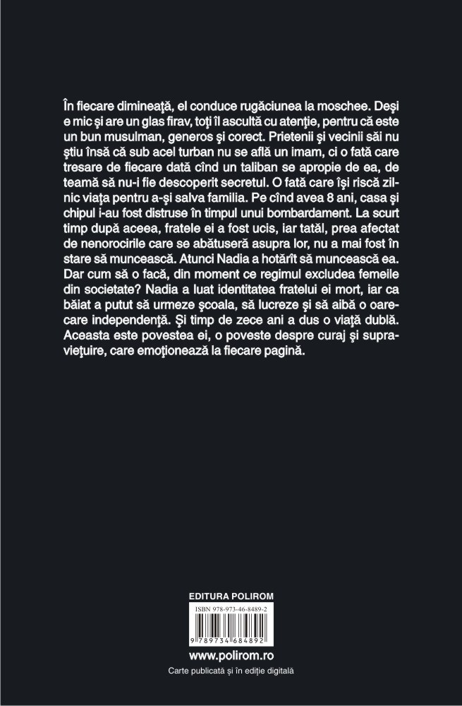 În fiecare dimineață, el conduce rugăciunea la moschee. Deși e mic și are un glas firav, toți îl ascultă cu atenție, pentru că este un bun musulman, generos și corect. Prietenii și vecinii săi nu știu însă că sub acel turban nu se află un imam, ci o fată care tresare de fiecare dată cînd un taliban se apropie de ea, de teamă să nu-i fie descoperit secretul. O fată care își riscă zilnic viața pentru a-și salva familia. Pe cînd avea 8 ani, casa și chipul i-au fost distruse în timpul unui bombardament. La scurt timp după aceea, fratele ei a fost ucis, iar tatăl, prea afectat de nenorocirile care se abătuseră asupra lor, nu a mai fost în stare să muncească. Atunci Nadia a hotărît să muncească ea. Dar cum să o facă, din moment ce regimul excludea femeile din societate? Nadia a luat identitatea fratelui ei mort, iar ca băiat a putut să urmeze școala, să lucreze și să aibă o oarecare independență. Și timp de zece ani a dus o viață dublă. Aceasta este povestea ei, o poveste despre curaj și supraviețuire, care emoționează la fiecare pagină.