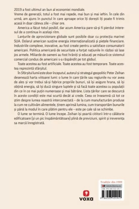 În Sfârșitul lumii este doar începutul, autorul și strategul geopolitic Peter Zeihan desenează harta viitoarei lumi: o lume în care țările sau regiunile nu vor avea de ales și vor trebui să-și fabrice propriile bunuri, să își asigure hrana, să își obțină energia, să își ducă singure luptele și să facă toate acestea cu populații din ce în ce mai puțin numeroase și mai bătrâne. Lista țărilor care se descurcă în aceste condiții este mai scurtă decât ai crede. Ceea ce înseamnă că tot ce știm despre lumea noastră interconectată – de la cum manufacturăm produse la cum ne cultivăm alimentele, ținem aprinsă lumina, cum transportăm bunurile și până la modul în care plătim pentru ele – este pe cale să se schimbe.