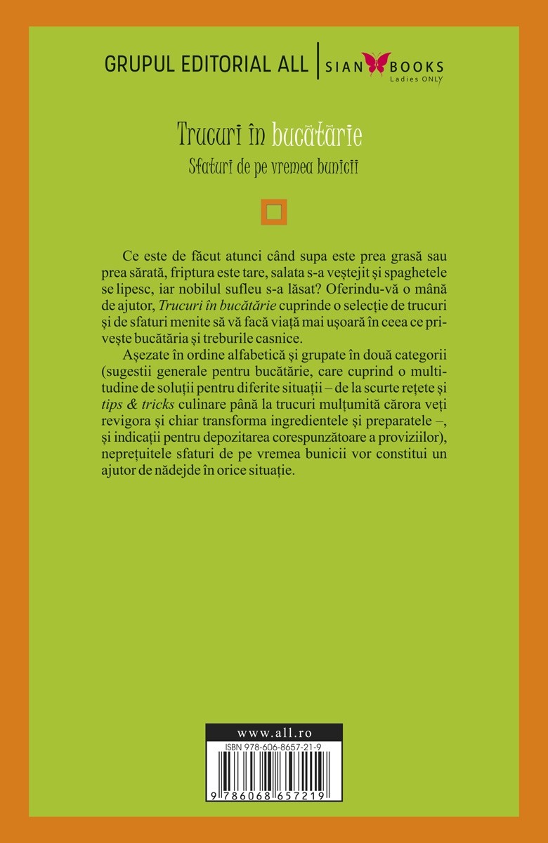 Odată ce ai intrat în bucătărie, devine inevitabilă întâlnirea cu felurite provocări care te pot lăsa fără replică: supa este ori prea grasă, ori prea sărată, carnea a ieșit prea tare, salata e veștedă, spaghetele se lipesc, nobilul sufleu s-a lăsat, aroma de varză a cotropit toată casa, mâinile îți miros a usturoi, și, ca tabloul să fie complet… musafirii bat deja la ușă. Iar acesta este momentul în care îți aduci aminte că rezervele de cafea și de alcool sunt pe terminate. Noroc că ai acum la îndemână neprețuitele sfaturi de pe vremea bunicii, care te scot din orice încurcătură!