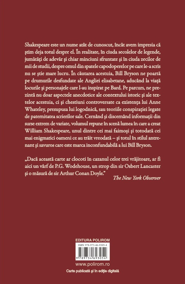 Shakespeare este un nume atât de cunoscut, încât avem impresia că știm deja totul despre el. În realitate, în ciuda secolelor de legende, jumătăţi de adevăr și chiar minciuni sfruntate și în ciuda zecilor de mii de studii, despre omul din spatele capodoperelor pe care le-a scris nu se știe mare lucru. În căutarea acestuia, Bill Bryson ne poartă pe drumurile desfundate ale Angliei elisabetane, aducând la viaţă locurile și personajele care l-au inspirat pe Bard. Pe parcurs, ne prezintă nu doar aspectele anecdotice ale contextului istoric și ale textelor acestuia, ci și chestiuni controversate ca existenţa lui Anne Whateley, presupusa lui logodnică, sau teoriile conspiraţiei legate de paternitatea scrierilor sale. Cernând și discernând informaţii din surse extrem de variate, volumul repune în scenă lumea în care a creat William Shakespeare, unul dintre cei mai faimoși și totodată cei mai enigmatici oameni ce au trăit vreodată – și totul în stilul antrenant și savuros care este marca inconfundabilă a lui Bill Bryson.