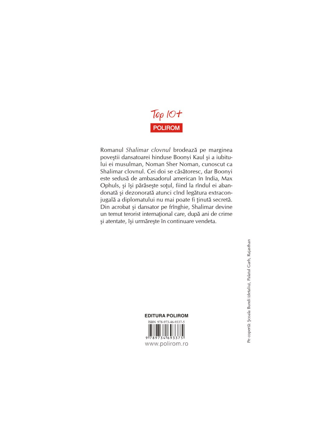 Romanul Shalimar clovnul brodează pe marginea poveştii dansatoarei hinduse Boonyi Kaul şi a iubitului ei musulman, Noman Sher Noman, cunoscut ca Shalimar clovnul. Cei doi se căsătoresc, dar Boonyi este sedusă de ambasadorul american în India, Max Ophuls, şi îşi părăseşte soţul, fiind la rândul ei abandonată şi dezonorată atunci când legătura extraconjugală a diplomatului nu mai poate fi ţinută secretă. Din acrobat şi dansator pe frânghie, Shalimar devine un temut terorist internaţional care, după ani de crime şi atentate, îşi urmăreşte în continuare vendeta.