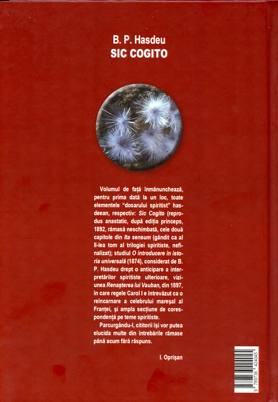 Volumul de fata inmanuncheaza pentru prima data la un loc toate elementele „dosarului spiritist“ hasdeean, respectiv: Sic cogito (reprodus anastatic, dupa editia princeps, 1892, ramasa neschimbata, cele doua capitole din Ita sensum, gandit ca al II-lea tom al trilogiei spiritiste, nefinalizat); studiul O introducere in istoria universala (1874), considerat de B.P.Hasdeu drept o anticipare a intrepretarilor spiritiste ulterioare, viziunea Renasterea lui Vauban din 1897, in care regele Carol I e intrevazut ca o reincarcare a celebrului maresal al Frantei si ampla sectiune de corespondenta pe teme spiritiste. Parcurgandu-l, cititorii isi vor putea elucida multe din intrebarile ramase pana acum fara raspuns. - I. Oprisan