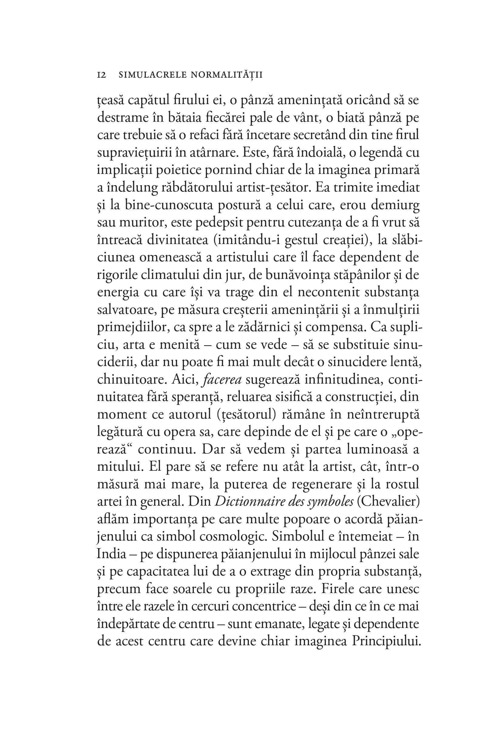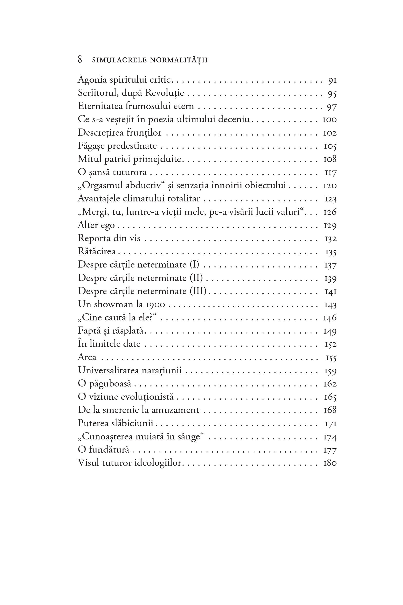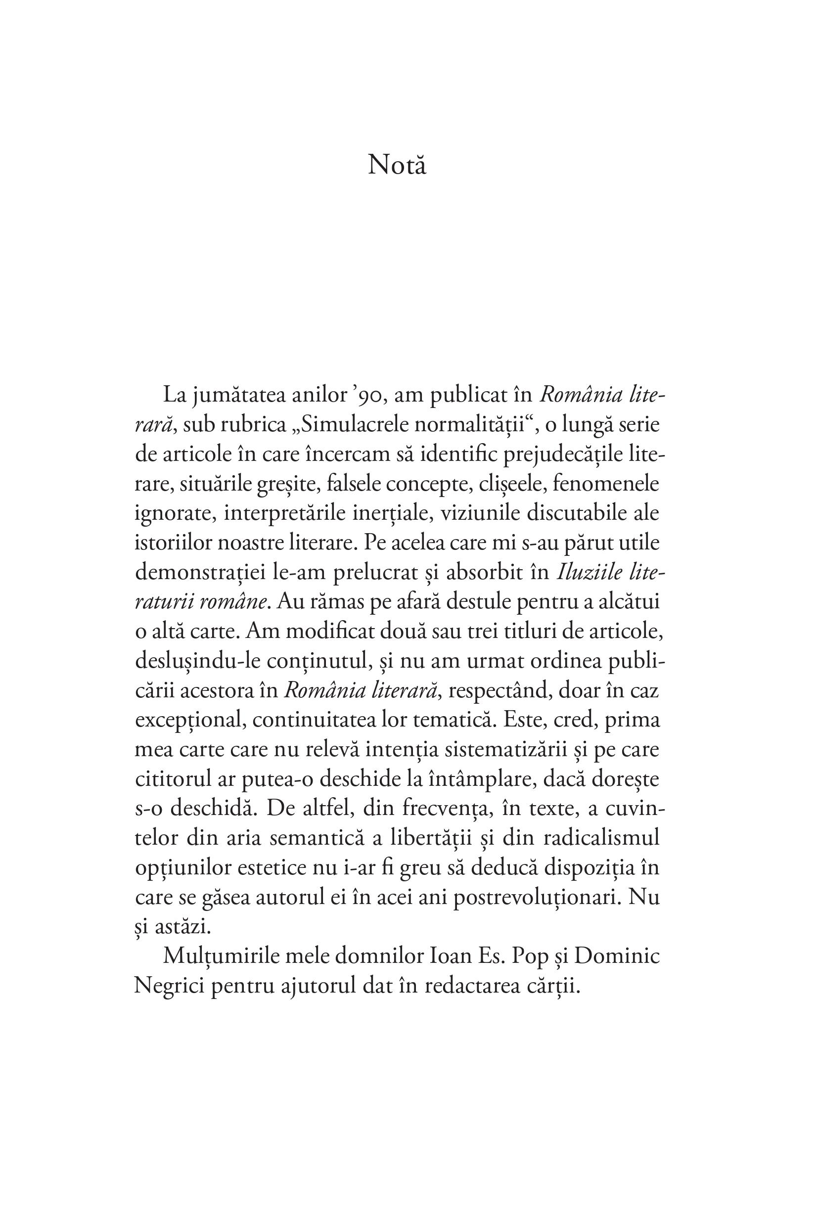 În fermecătoarele eseuri din Simulacrele normalității, criticul își propune, după cum mărturisește, să identifice „prejudecăţile literare, situările greşite, falsele concepte, clişeele, fenomenele ignorate, interpretările inerţiale, viziunile discutabile ale istoriilor noastre literare“. Fie că se oprește asupra poeziei boierilor stihuitori de la începutul secolului al XIX-lea, asupra avangardei literare ori asupra literaturii române în comunism sau imediat după, autorul ne cucerește prin impetuozitatea și forța sa argumentativă.