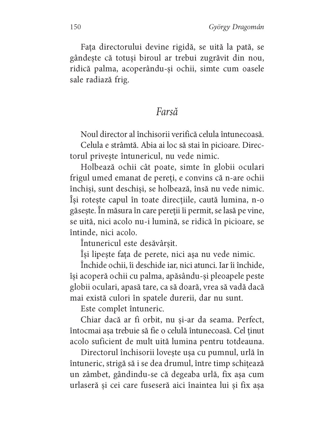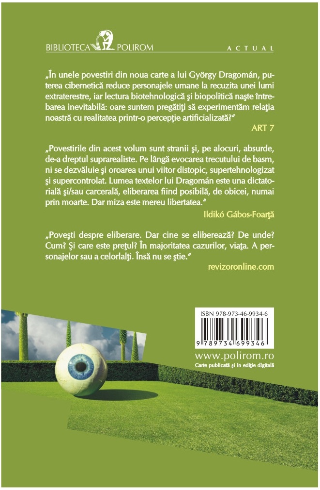„În unele povestiri din noua carte a lui György Dragomán, puterea cibernetică reduce personajele umane la recuzita unei lumi extraterestre, iar lectura biotehnologică şi biopolitică naşte întrebarea inevitabilă: oare suntem pregătiţi să experimentăm relaţia noastră cu realitatea printr-o percepţie artificializată?” (ART 7)