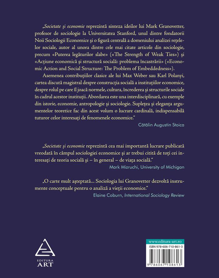"Societate şi economie reprezintă sinteza ideilor lui Mark Granovetter, profesor de sociologie la Universitatea Stanford, unul dintre fondatorii Noii Sociologii Economice și o figură centrală a domeniului analizei reţelelor sociale, autor al unora dintre cele mai citate articole din sociologie, precum «Puterea legăturilor slabe» («The Strength of Weak Ties») şi «Acţiune economică şi structură socială: problema încastrării» («Economic Action and Social Structure: The Problem of Embeddedness»).