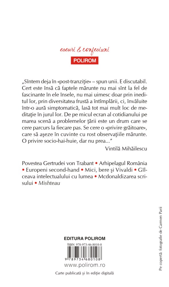 „Sîntem deja în «post-tranziţie» – spun unii. E discutabil. Cert este însă că faptele mărunte nu mai sînt la fel de fascinante în ele însele, nu mai uimesc doar prin ineditul lor, prin diversitatea frustă a întîmplării, ci, învăluite într-o aură simptomatică, lasă tot mai mult loc de meditaţie în jurul lor. De pe micul ecran al cotidianului pe marea scenă a problemelor ţării este un drum care se cere parcurs la fiecare pas. Se cere o «privire grăitoare», care să aşeze în cuvinte cu rost observaţiile mărunte. O privire socio-hai-huie, dar nu prea...” (Vintilă Mihăilescu)
