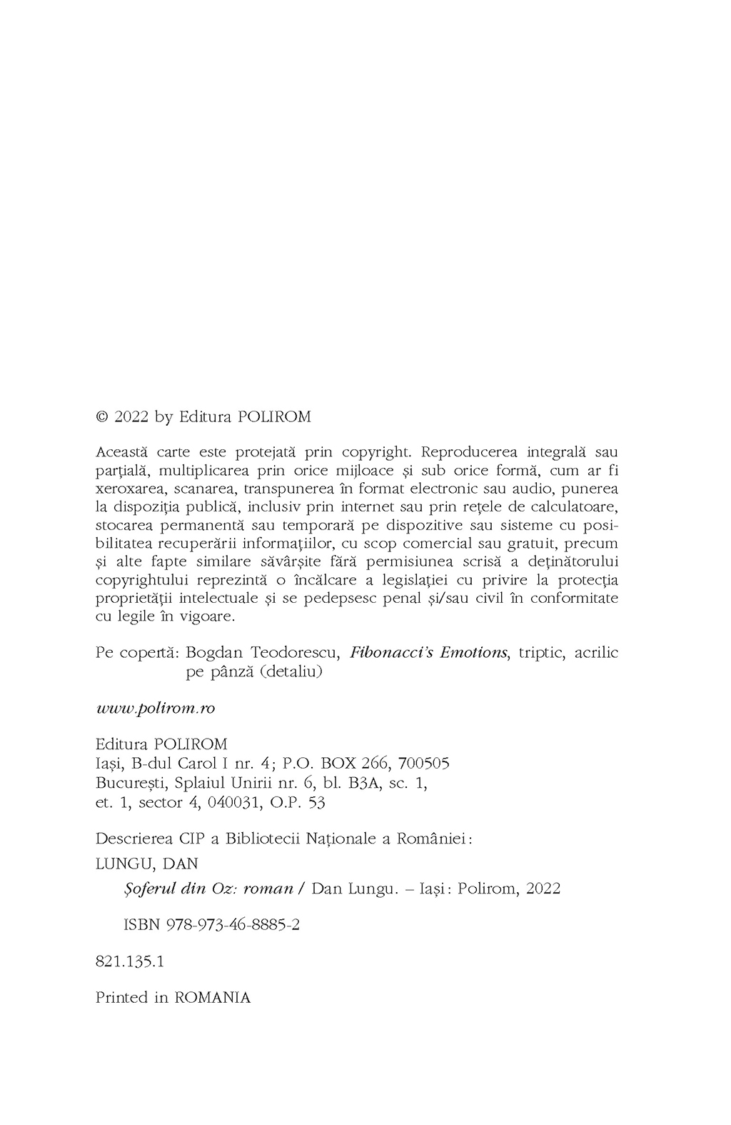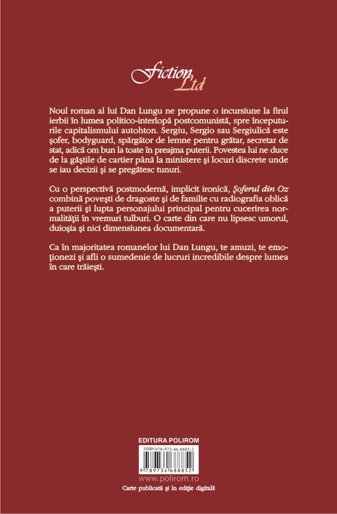 Cu o perspectivă postmodernă, implicit ironică, Șoferul din Oz combină povești de dragoste și de familie cu radiografia oblică a puterii și lupta personajului principal pentru cucerirea normalității în vremuri tulburi. O carte din care nu lipsesc umorul, duioșia și nici dimensiunea documentară.