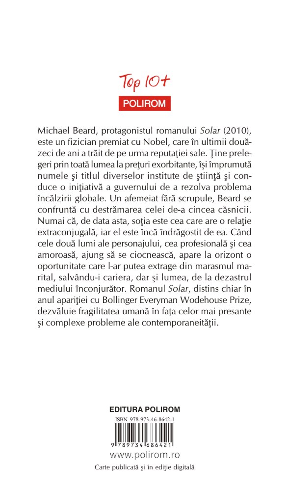 Michael Beard, protagonistul romanului Solar (2010), este un fizician premiat cu Nobel, care în ultimii douăzeci de ani a trăit de pe urma reputaţiei sale. Ţine prelegeri prin toată lumea la preţuri exorbitante, îşi împrumută numele şi titlul diverselor institute de ştiinţă şi conduce o iniţiativă a guvernului de a rezolva problema încălzirii globale. Un afemeiat fără scrupule, Beard se confruntă cu destrămarea celei de-a cincea căsnicii. Numai că, de data asta, soţia este cea care are o relaţie extraconjugală, iar el este încă îndrăgostit de ea. Cînd cele două lumi ale personajului, cea profesională şi cea amoroasă, ajung să se ciocnească, apare la orizont o oportunitate care l-ar putea extrage din marasmul marital, salvîndu-i cariera, dar şi lumea, de la dezastrul mediului înconjurător. Romanul Solar, distins chiar în anul apariţiei cu Bollinger Everyman Wodehouse Prize, dezvăluie fragilitatea umană în faţa celor mai presante şi complexe probleme ale contemporaneităţii.