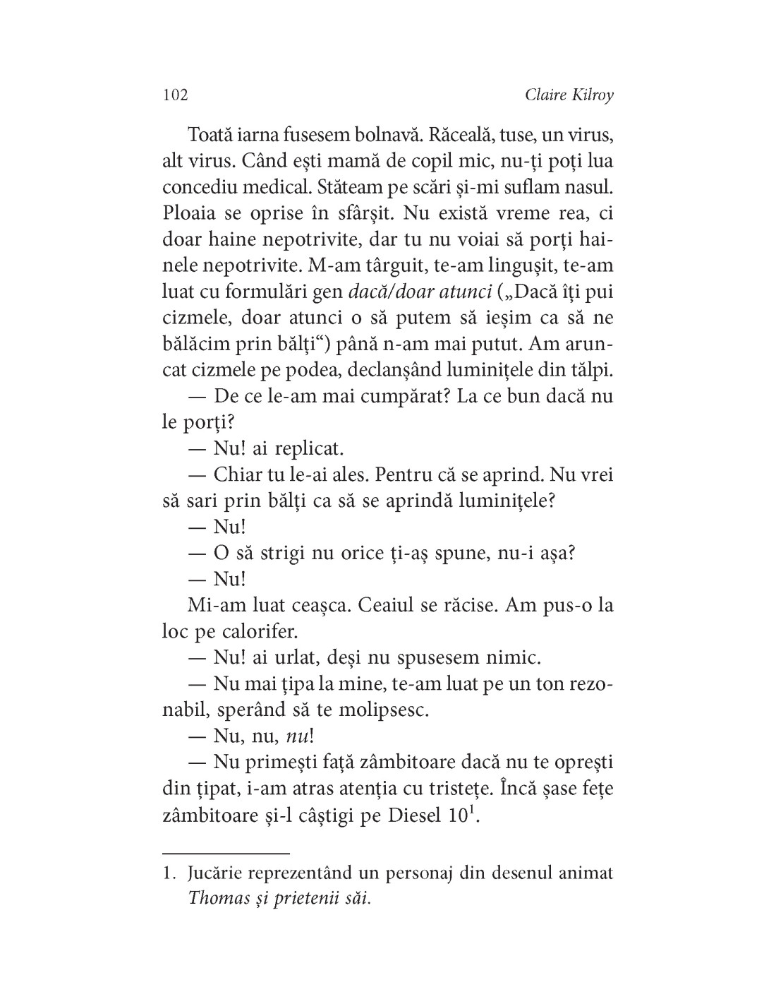 Cartea explorează ciocnirea dintre iubirea feroce pentru fiinţa plăpândă căreia i-a dat naştere şi schimbarea radicală la nivelul identităţii, autonomiei şi creativităţii prin care trece o mamă izolată şi lipsită de sprijin.