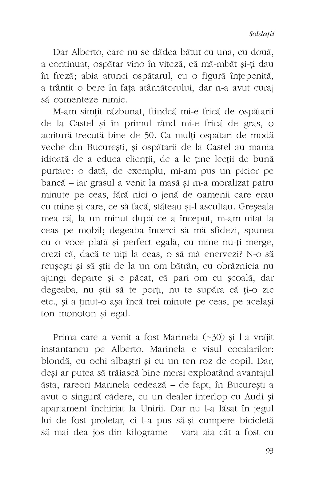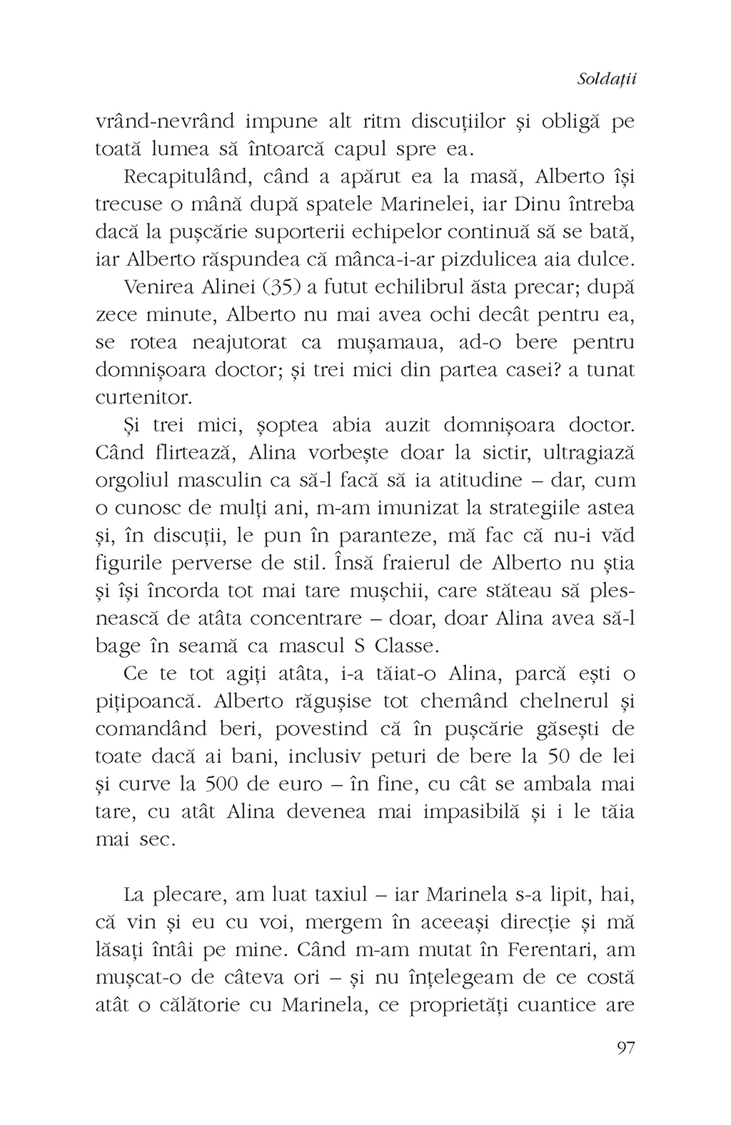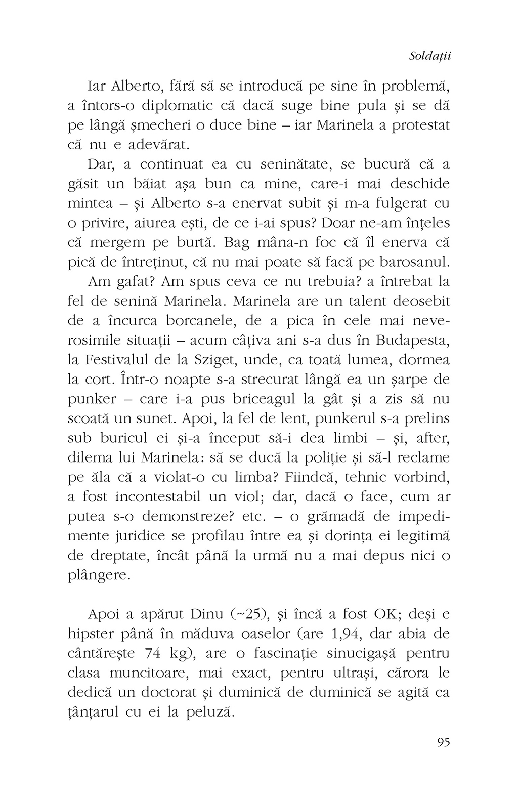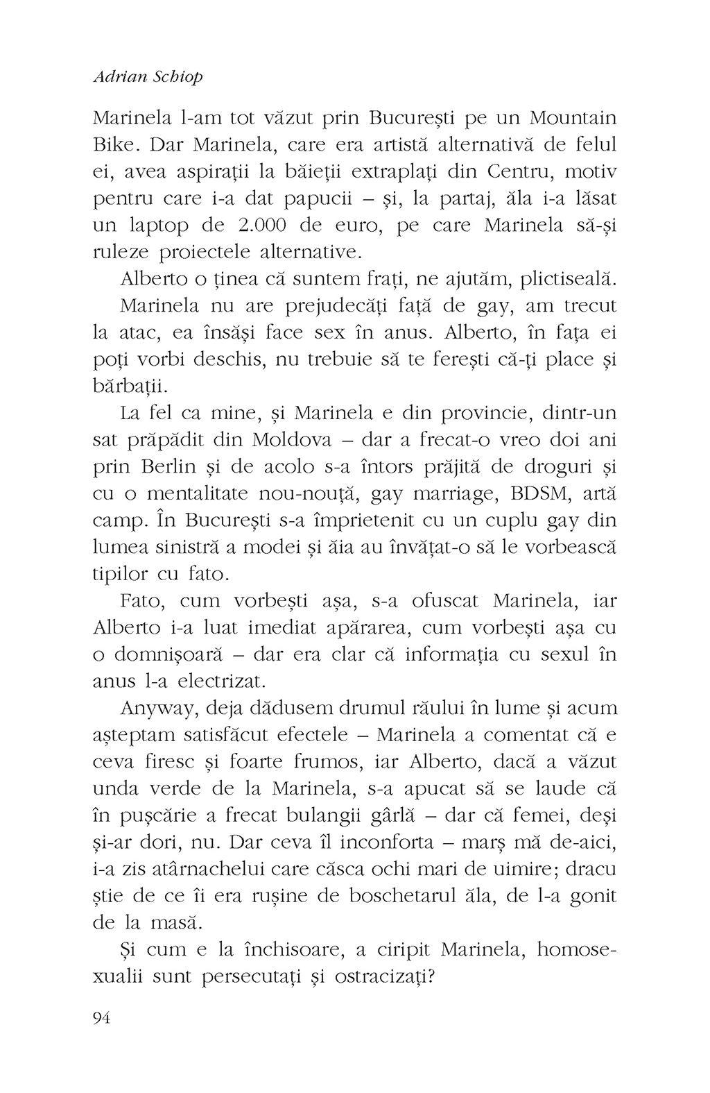 „Cartea mea e despre Ferentari, locul unde s-a inventat şmecheria, iar idolii multor puşti sînt Nuţu Cămătaru, Gigi Becali şi Florin Salam. Mai e despre iubirea – interesată? dezinteresată? – dintre un scriitor aterizat în cel mai sărac cartier al Bucureştiului şi un fost puşcăriaş care s-a învăţat să-i placă şi bărbaţii, fiindcă avea 15 ani la prima condamnare, iar prin sex se cumpără cel mai ieftin protecţie. E despre cum s-o scoţi la capăt în libertate cînd te-ai născut într-o familie mîndră de interlopi, dar la pîrnaie – timp de 14 ani – te-ai obişnuit pe invers. Toate astea sînt fapte despre care dă seama cartea mea; altfel, îmi place să cred că e despre loialitate şi trădare.” (Adrian Schiop)