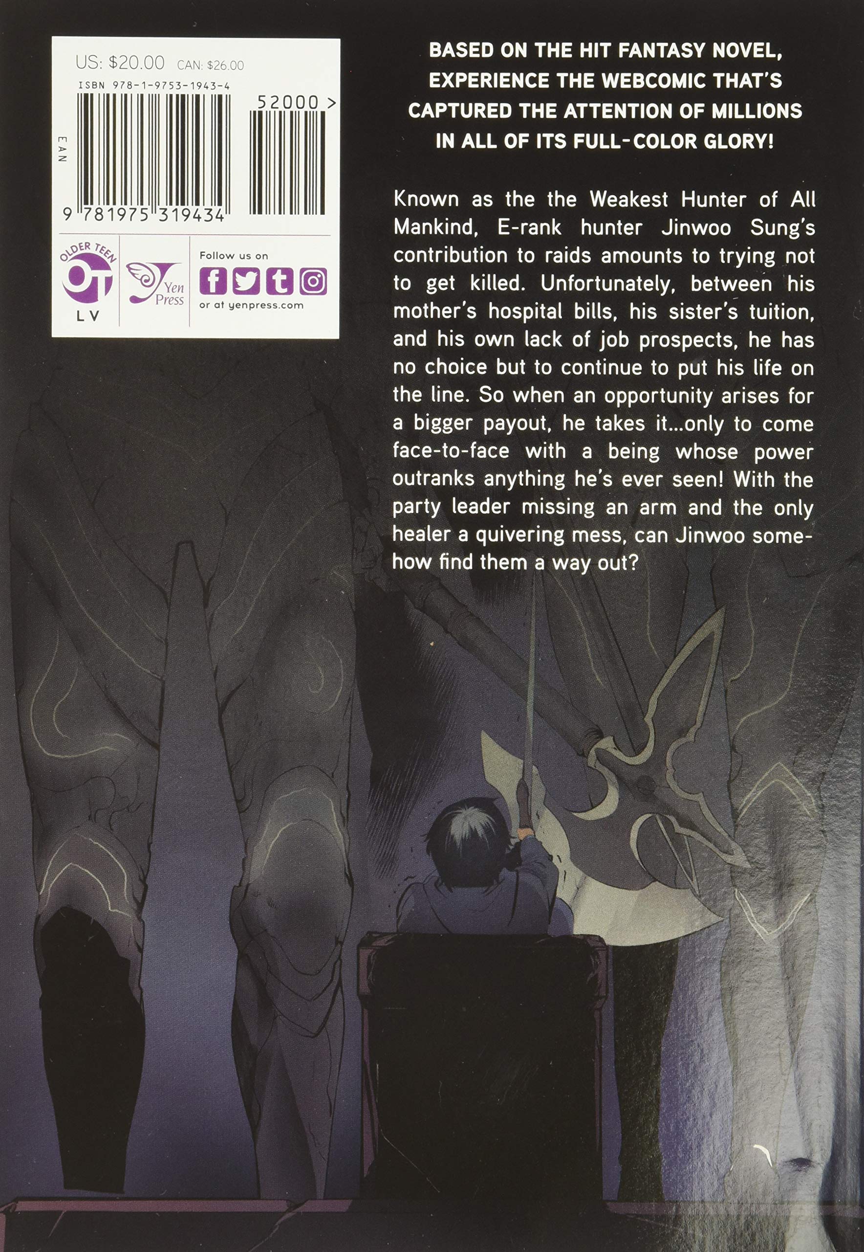 The official English print publication of the popular Korean webcomic! E-class hunter Jinwoo Sung is the weakest of them all. Looked down on by everyone, he has no money, no abilities to speak of, and no other job prospects. So when his party finds a hidden dungeon, he's determined to use this chance to change his life for the better... but the opportunity he finds is a bit different from what he had in mind!