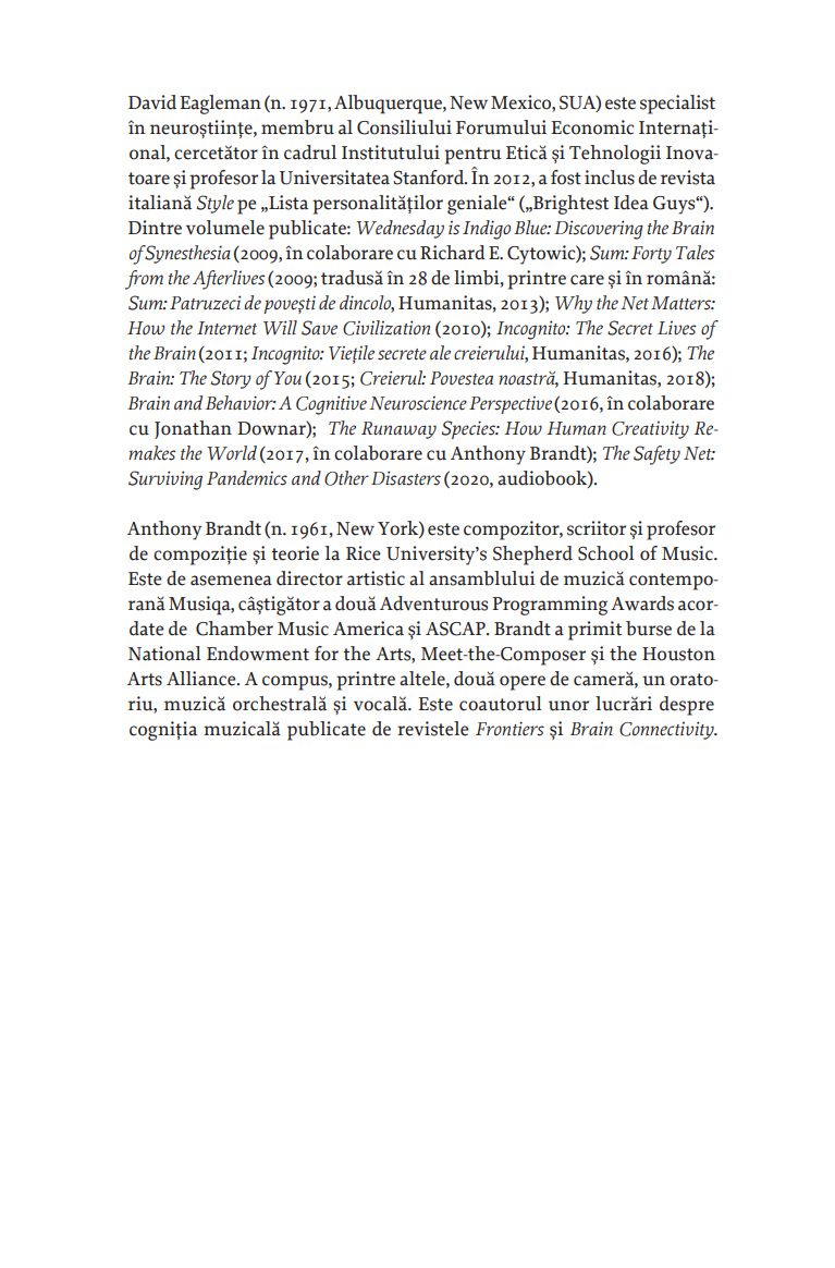 Împletind artele și științele, specialistul în neuroștiințe David Eagleman și compozitorul Anthony Brandt explorează nevoia de noutate, simularea viitorurilor posibile și componentele sociale care animă inventivitatea speciei noastre. Antrenându-ne într-un tur al creativității umane, de la Picasso la mașinile-concept și călătoriile pe Lună, Brandt și Eagleman examinează software-ul cognitiv care generează noi idei și aruncă o lumină asupra aspectelor esențiale ale mentalității creative. Atunci când înțelegem capacitatea noastră de a inova, putem face față provocării de a remodela lumea în care trăim, și care e în permanentă schimbare. Cei doi autori explică puterea speciei umane de a prefigura și construi viitorul, căutând sursele creativității, trăsăturile comune ale actelor creative și modalitățile prin care le-am putea folosi pentru a ne îmbunătăți viața cotidiană, sistemul școlar și instituțiile.