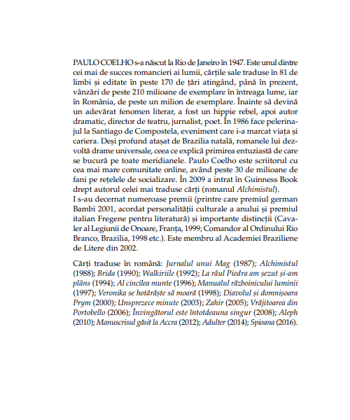 La aproape un secol de la moartea ei, Paulo Coelho recompune, pornind de la documente de arhivă nepublicate, portretul captivant al uneia dintre cele mai enigmatice, curajoase și independente femei din istorie. De la copilăria într-un orășel olandez, la viața traumatizantă alături de un ofițer alcoolic în Java și până la anii de glorie în capitala Franței, Spioana e un puzzle fascinant și o lecție admirabilă despre echilibrul fragil dintre nonconformism și luciditate.