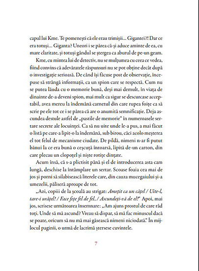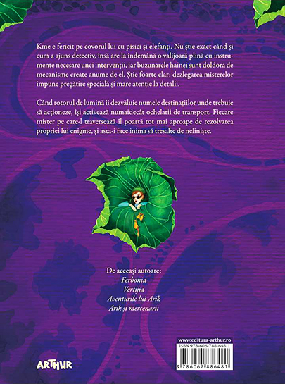 Kme e fericit pe covorul lui cu pisici și elefanți. Nu știe exact când și cum a ajuns detectiv, însă are la îndemână o valijoară plină cu instrumente necesare unei intervenții, iar buzunarele hainei sunt doldora de mecanisme create anume de el. Știe foarte clar: dezlegarea misterelor impune pregătire specială și mare atenție la detalii.