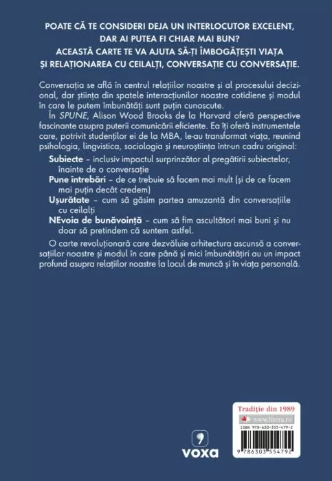 În SPUNE, Alison Wood Brooks de la Harvard oferă perspective fascinante asupra puterii comunicării eficiente. Ea îți oferă instrumentele care, potrivit studenților ei de la MBA, le -au transformat viața, reunind psihologia, lingvistica, sociologia și neuroștiința într-un cadru original: