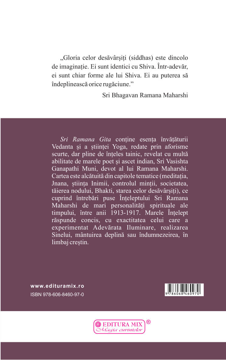 Sri Ramana Gita conține esența învățăturii Vedanta și a științei Yoga (Mantra Yoga, Raja Yoga, Jnana Yoga și Bhakti Yoga), redate prin aforisme scurte, dar pline de înțeles tainic, revelat cu multă abilitate de marele poet și ascet indian, Sri Vasishta Ganapathi Muni, devot al marelui Înțelept Bhagavan Sri Ramana Maharshi. Cartea este alcătuită din capitole tematice (meditația, Jnana, știința Inimii, controlul minții, societatea, tăierea nodului, Bhakti, starea celor desăvârșiți etc.) ce cuprind întrebări puse Înțeleptului Sri Ramana Maharshi de mari personalități spirituale ale timpului (inclusiv de autor), între anii 1913-1917. Marele Înțelept răspunde concis, cu exactitatea celui care a experimentat Adevărata Iluminare, realizarea Sinelui, mântuirea deplină sau îndumnezeirea, în limbaj creștin.