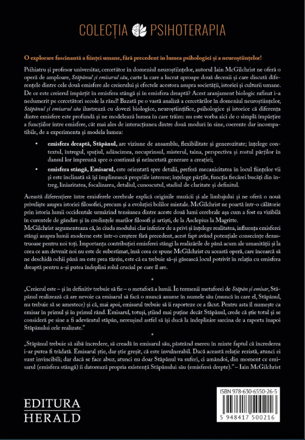 In aceasta opera de amploare, Iain McGilchrist ne prezinta o explorare fascinanta a diferentelor dintre emisfera stanga si cea dreapta a creierului si modul in care aceste diferente au afectat societatea, istoria si cultura. McGilchrist porneste de la cele mai cercetari in neurostiinta si psihologie pentru a dezvalui ca diferenta este una profunda: emisfera stanga este orientata spre detalii, ordine, rațiune in timp ce cea dreapta are o mai mare inclinatie catre experienta, flexibilitate si generozitate. McGilchrist ne conduce intr-o calatorie prin istoria culturii occidentale, ilustrand tensiunea dintre aceste doua lumi, asa cum este revelata in gandirea si credinta ganditorilor si artistilor de la Eschil la Magritte.
