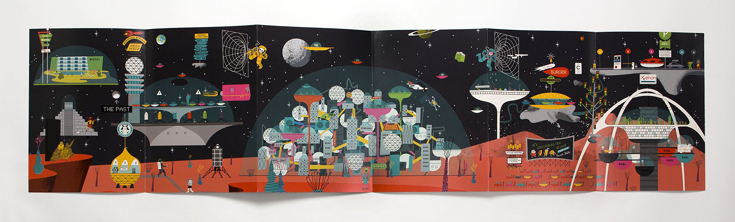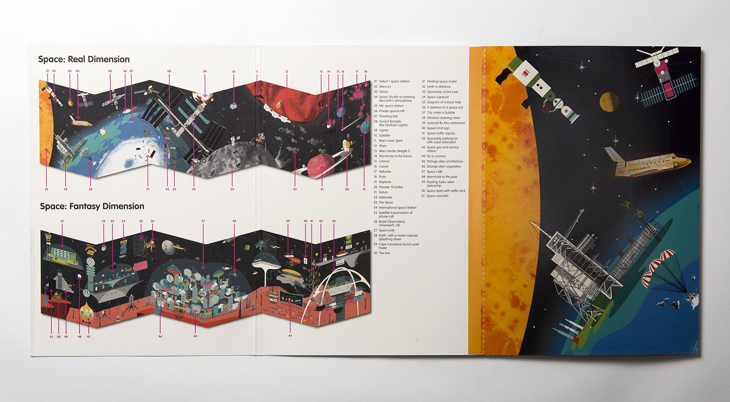 Escape Earth's atmosphere and enter Stickyscapes Space! Over 100 removable stickers and a double-sided panoramic space scene let you learn everything about our solar system and beyond. One side of the panorama is based upon real space adventures, so includes our own solar system alongside NASA shuttles, Russian rockets and space-walking astronauts. Escape through a wormhole to the other side, which is based on imaginary and futuristic cosmic adventures in deep space, including aliens, imaginative sci-fi inventions and even a space hotel!