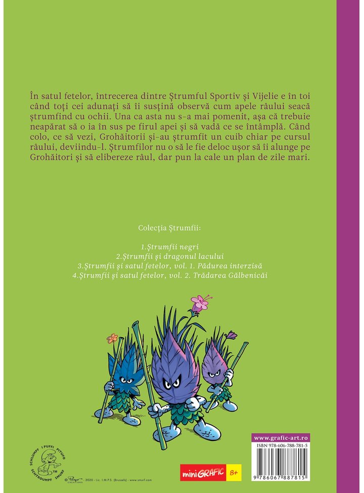 În satul fetelor, întrecerea dintre Ștrumful Sportiv și Vijelie e în toi când toți cei adunați să îi susțină observă cum apele râului seacă ștrumfind cu ochii. Una ca asta nu s-a mai pomenit, așa că trebuie neapărat să o ia în sus pe firul apei și să vadă ce se întâmplă. Când colo, ca să vezi, Grohăitorii și-au ștrumfit un cuib chiar pe cursul râului, deviidu-l. Ștrumfilor nu o să le fie deloc ușor să îi alunge pe Grohăitori și să elibereze râul, dar pun la cale un plan de zile mari.