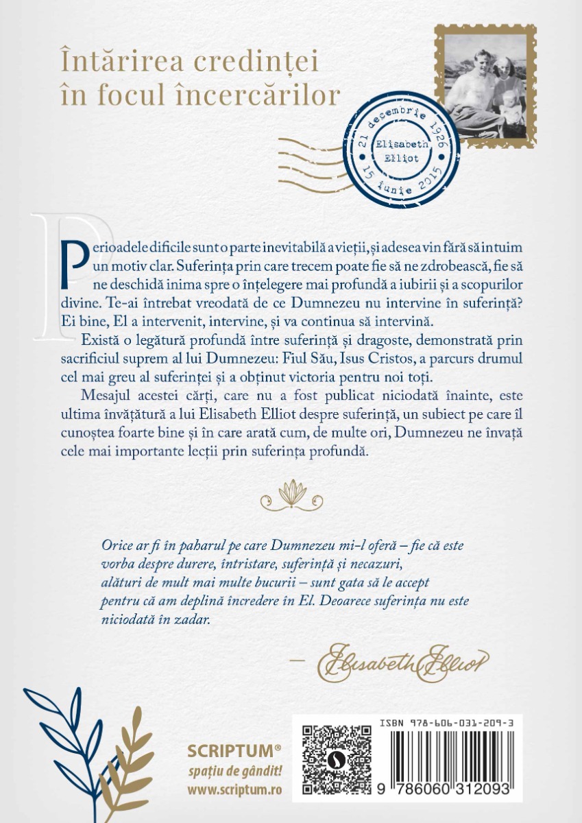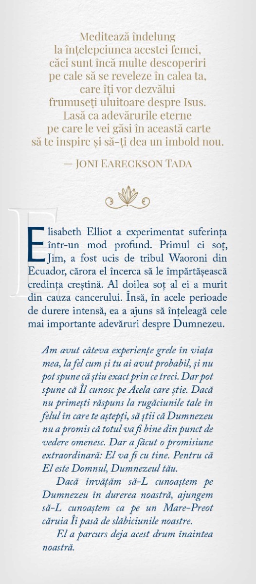 Mesajul acestei carti, care nu a fost publicat niciodata inainte, este ultima invatatura a lui Elisabeth Elliot despre suferinta, un subiect pe care il cunostea foarte bine si in care arata cum, de multe ori, Dumnezeu ne invata cele mai importante lectii prin suferinta profunda.