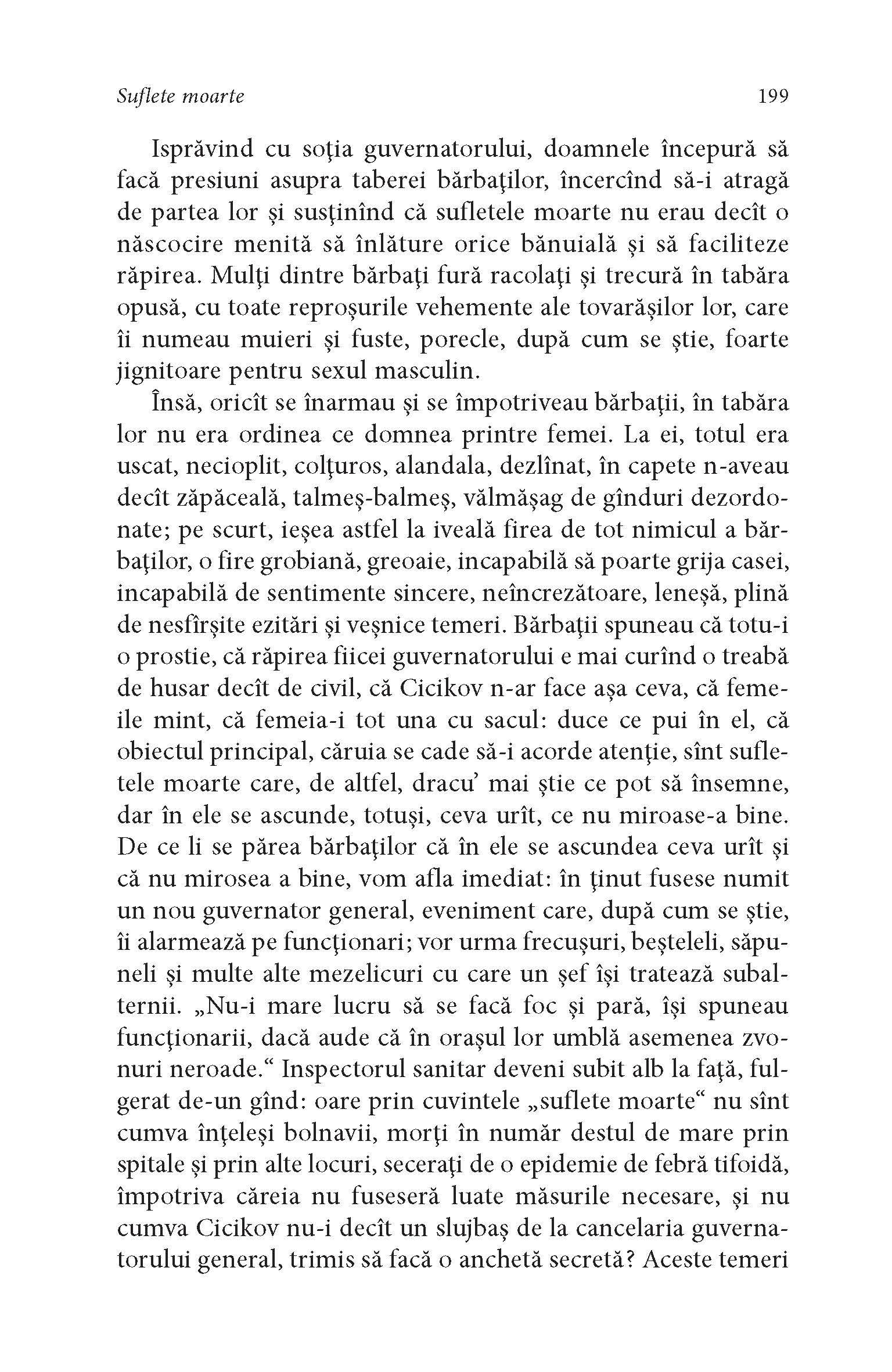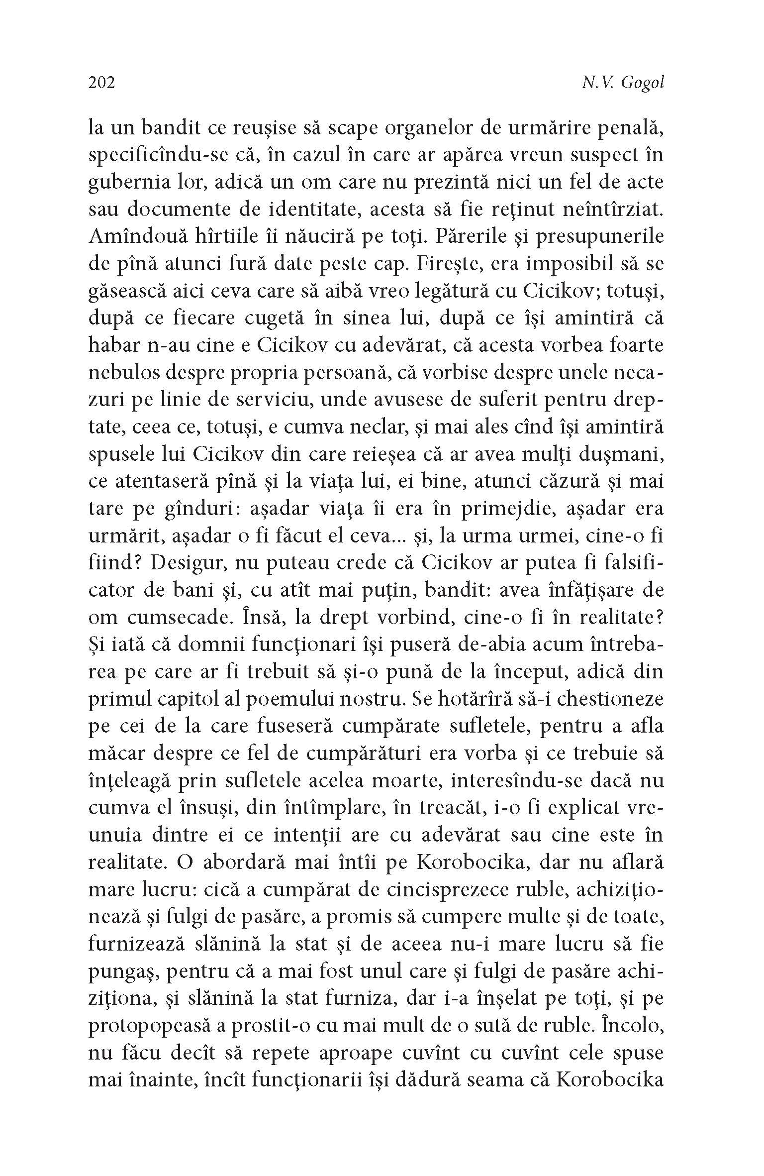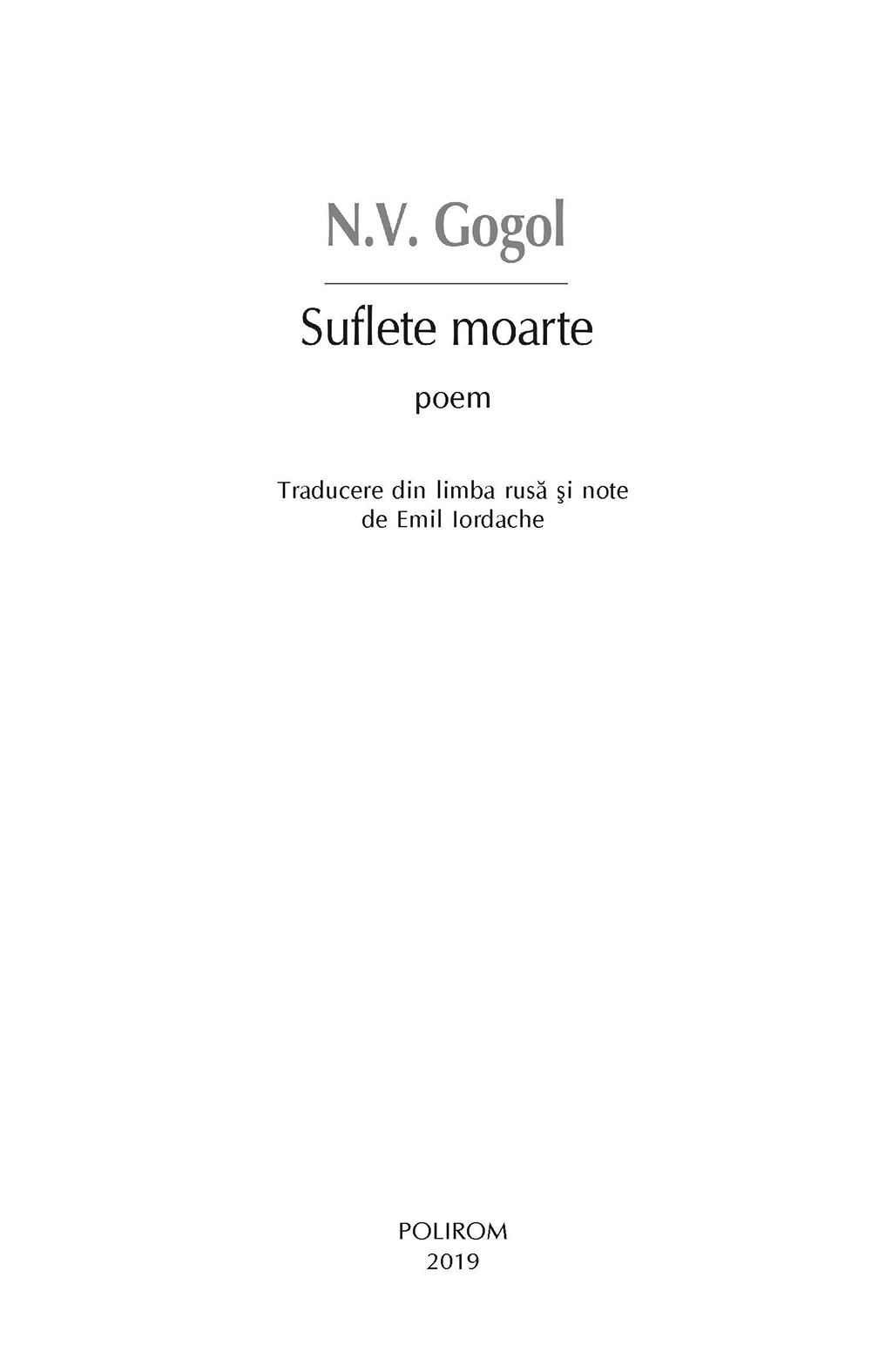 În mijlocul bîrfelor şi al torporii unui orăşel obişnuit din Rusia, încremenit în prostie şi corupţie, se insinuează un om onorabil, dornic să cucerească inimile noilor săi concetăţeni. Repede plăcut de apropiaţi, agreabil şi prietenos, scopurile lui sînt, în aparenţă, celebritatea şi bogăţia. Curînd, cine ajunge să-l cunoască va descoperi că personajul cu pricina, Cicikov, are o pasiune stranie: el nu umblă prin lume pentru a-i tezauriza bunurile, ci caută răbdător o marfă aparte – suflete moarte. O poveste despre sufletul rus prins în patimi vechi şi în laţul neputinţei şi al corupţiei, Suflete moarte este poemul pierzaniei perpetue al fiinţei care-şi dă frîu disperării şi-şi găseşte mîngîierea în înţelepciunea strigată tărăgănat, dramatic: „Unde-i acela care, în limba maternă a sufletului nostru rus, s-ar pricepe să rostească acest cuvînt atotputernic: Înainte!? Unde-i acela care, cunoscînd toate forţele şi însuşirile şi întreaga adîncime a firii noastre, printr-o singură fluturare ademenitoare şi plină de vrajă a mîinii, ar putea să ne facă să ne luăm avînt către o viaţă superioară? Cu ce lacrimi, cu ce iubire l-ar răsplăti rusul recunoscător! Dar veacurile trec după veacuri şi o jumătate de milion de trîntori, de lălîi şi de mălăieţi dorm buştean; rareori se naşte în Rusia un bărbat care ştie să rostească acest cuvînt atotputernic!”