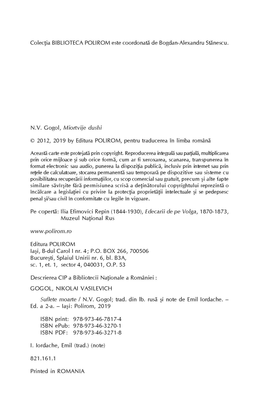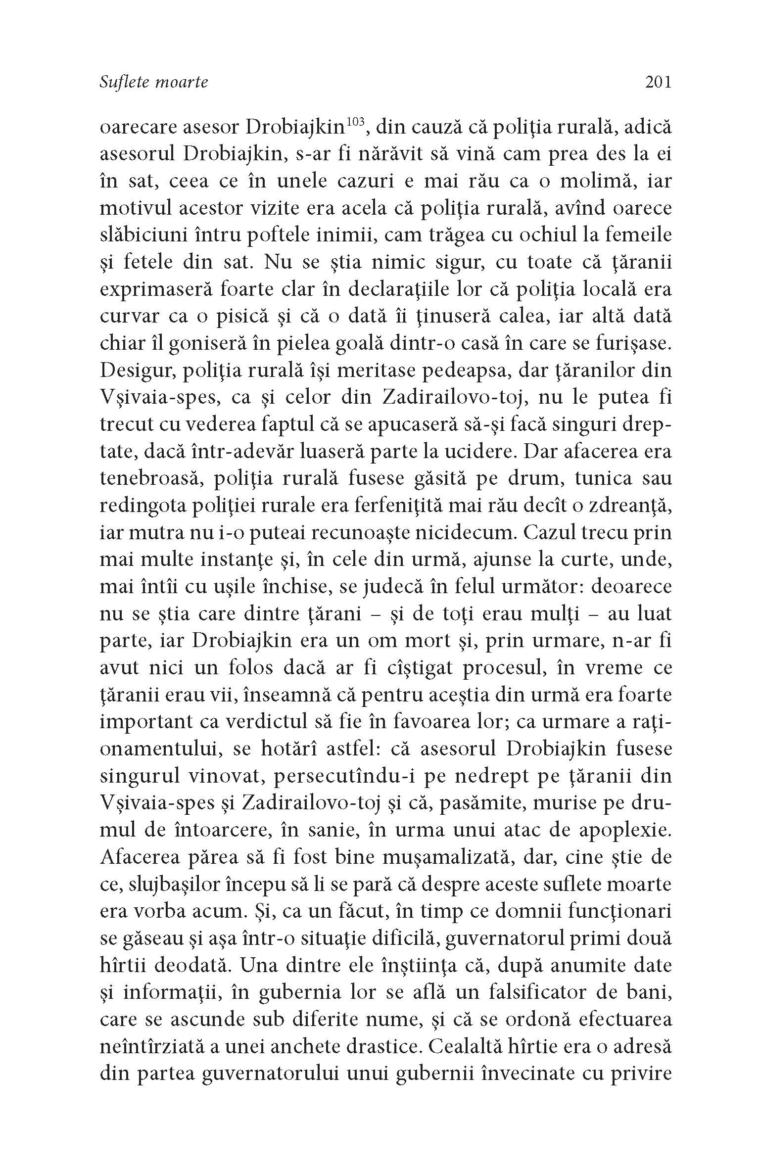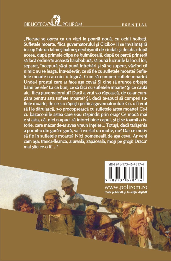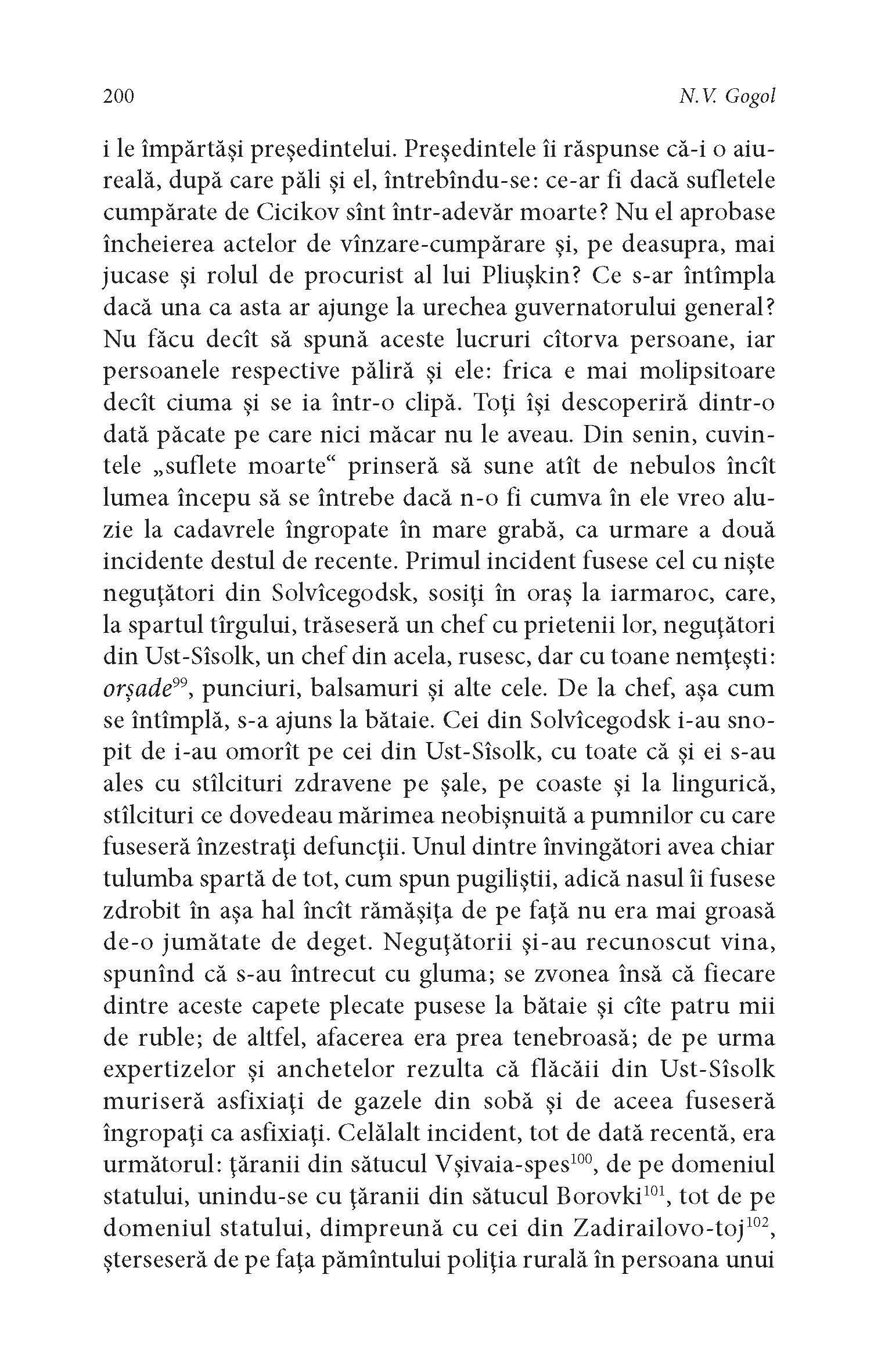 În mijlocul bîrfelor şi al torporii unui orăşel obişnuit din Rusia, încremenit în prostie şi corupţie, se insinuează un om onorabil, dornic să cucerească inimile noilor săi concetăţeni. Repede plăcut de apropiaţi, agreabil şi prietenos, scopurile lui sînt, în aparenţă, celebritatea şi bogăţia. Curînd, cine ajunge să-l cunoască va descoperi că personajul cu pricina, Cicikov, are o pasiune stranie: el nu umblă prin lume pentru a-i tezauriza bunurile, ci caută răbdător o marfă aparte – suflete moarte. O poveste despre sufletul rus prins în patimi vechi şi în laţul neputinţei şi al corupţiei, Suflete moarte este poemul pierzaniei perpetue al fiinţei care-şi dă frîu disperării şi-şi găseşte mîngîierea în înţelepciunea strigată tărăgănat, dramatic: „Unde-i acela care, în limba maternă a sufletului nostru rus, s-ar pricepe să rostească acest cuvînt atotputernic: Înainte!? Unde-i acela care, cunoscînd toate forţele şi însuşirile şi întreaga adîncime a firii noastre, printr-o singură fluturare ademenitoare şi plină de vrajă a mîinii, ar putea să ne facă să ne luăm avînt către o viaţă superioară? Cu ce lacrimi, cu ce iubire l-ar răsplăti rusul recunoscător! Dar veacurile trec după veacuri şi o jumătate de milion de trîntori, de lălîi şi de mălăieţi dorm buştean; rareori se naşte în Rusia un bărbat care ştie să rostească acest cuvînt atotputernic!”