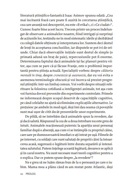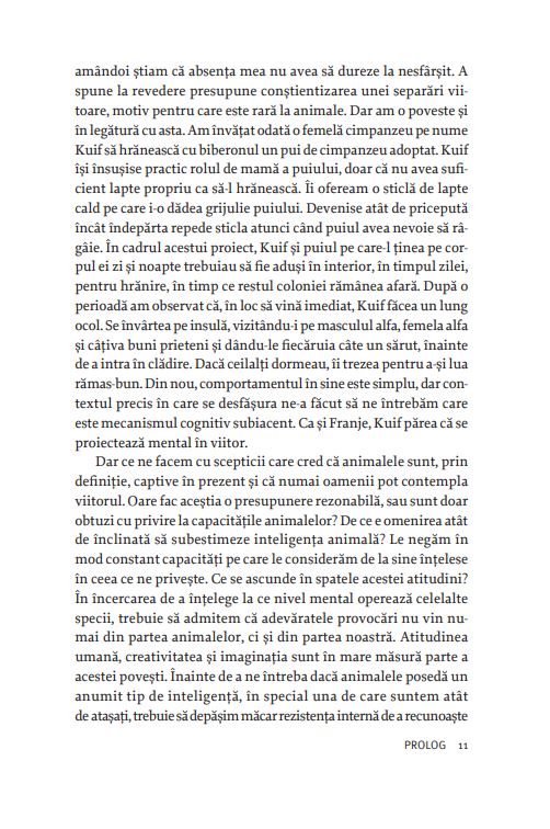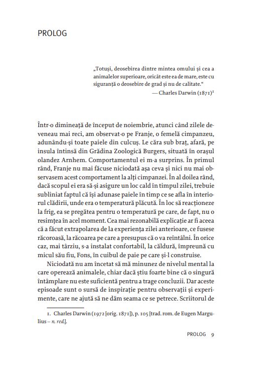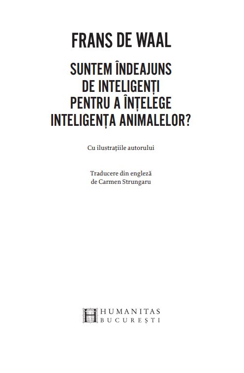 „De ce e omenirea atât de înclinată să subestimeze inteligența animalelor? Le negăm în mod con-stant capacități pe care le considerăm de la sine înțelese în ceea ce ne privește. Ce se ascunde în spatele acestei atitudini? În încercarea de a înțelege la ce nivel mental operează celelalte specii, trebuie să admitem că adevăratele provocări nu vin numai din partea animalelor, ci și din partea noastră. [...] Înainte de a ne întreba dacă animalele posedă un anumit tip de inteligență, în special una de care suntem atât de atașați, trebuie să depășim măcar rezistența internă de a recunoaște această posibilitate. De aici și întrebarea centrală a acestei cărți: «Suntem îndeajuns de inteligenți pentru a înțelege inteligența animalelor?»“ – FRANS DE WAAL
