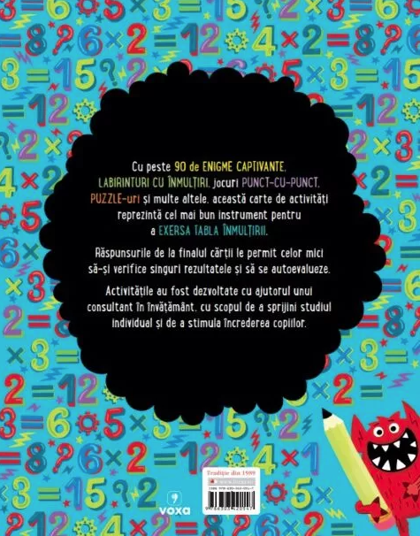 Cu peste 90 de ENIGME CAPTIVANTE, LABIRINTURI CU ÎNMULȚIRI, jocuri PUNCT-CU-PUNCT, PUZZLE-uri și multe altele, această carte de activități reprezintă cel mai bun instrument pentru a EXERSA TABLA ÎNMULȚIRII.