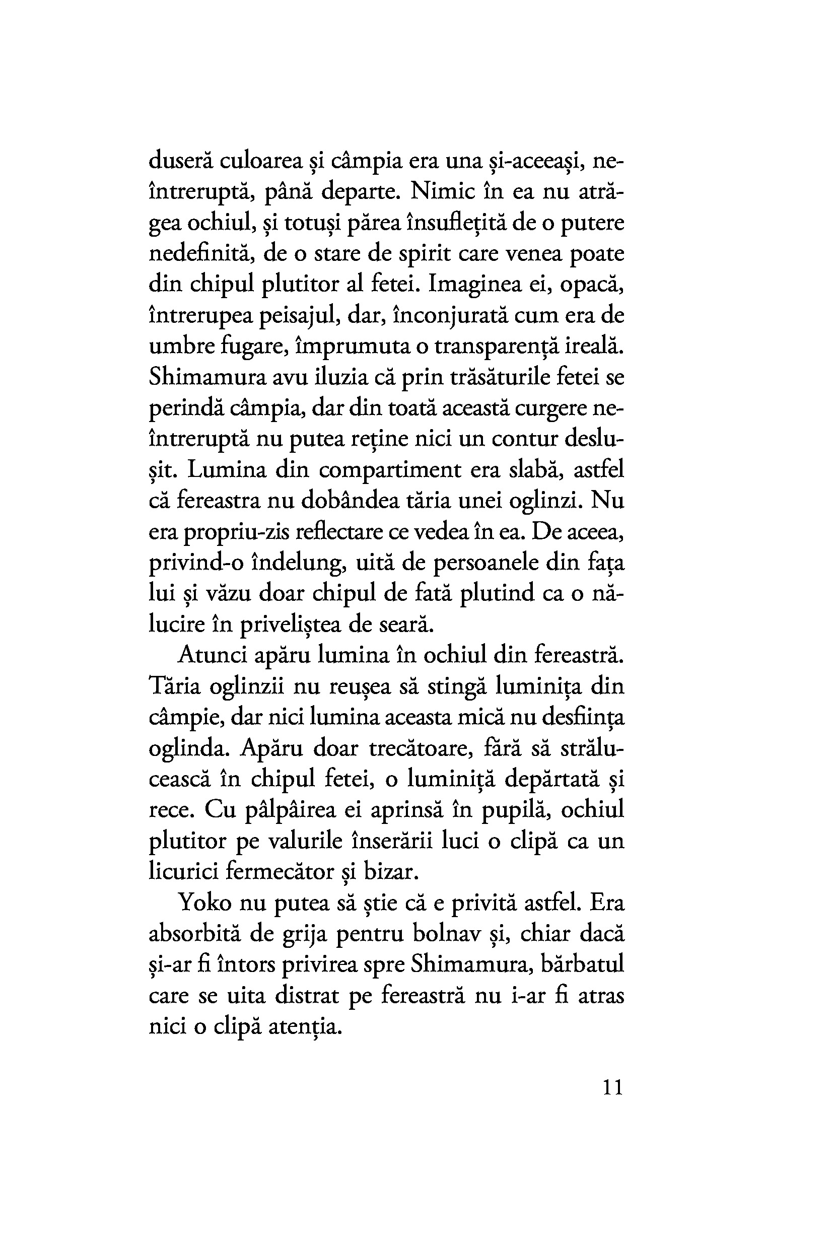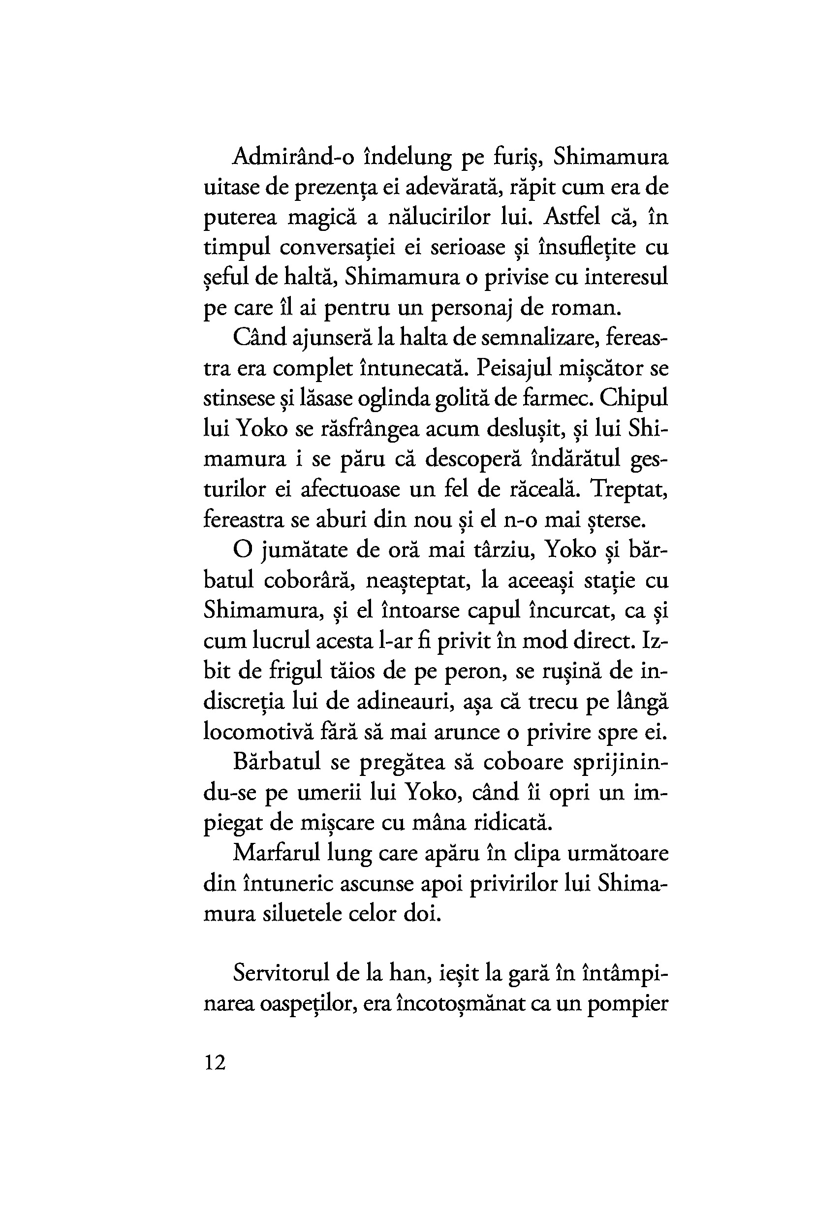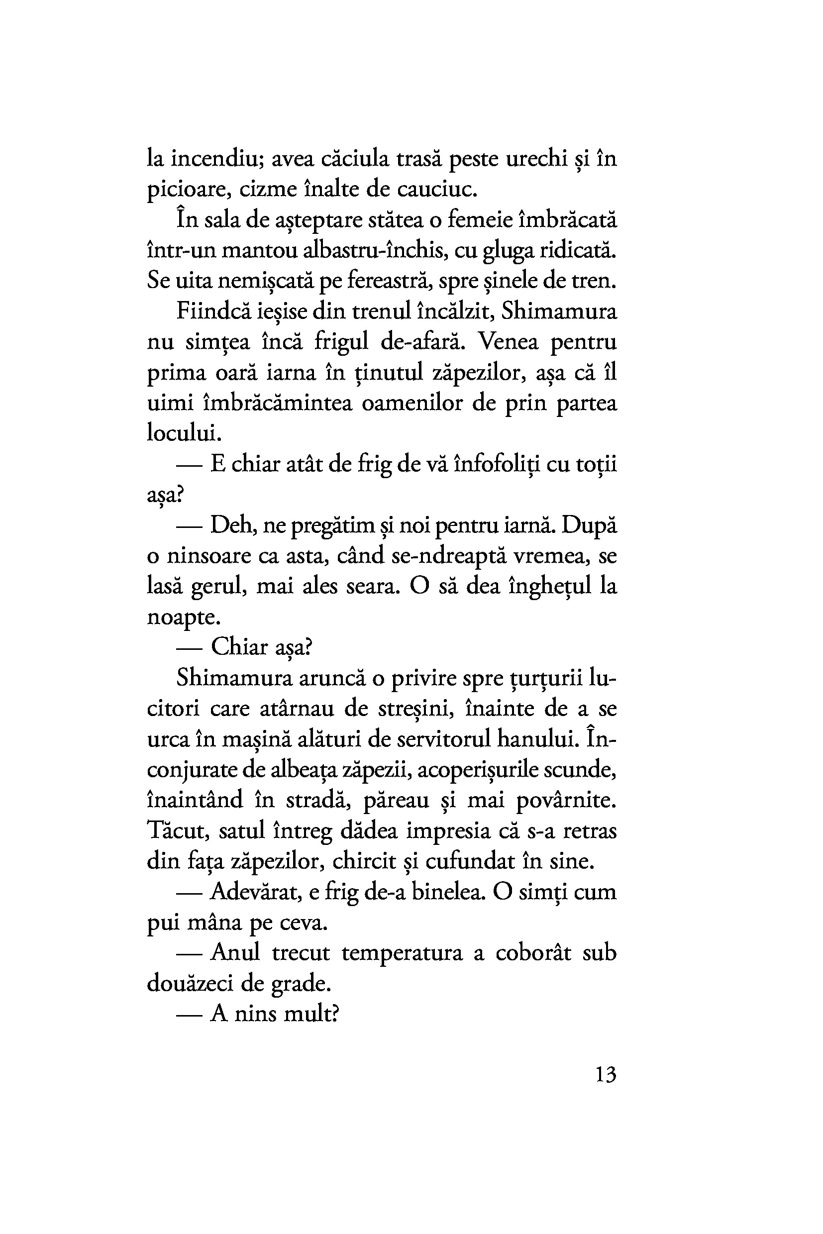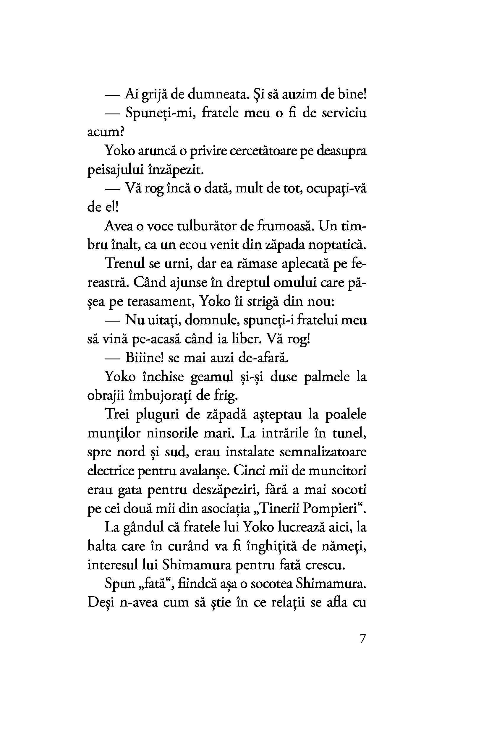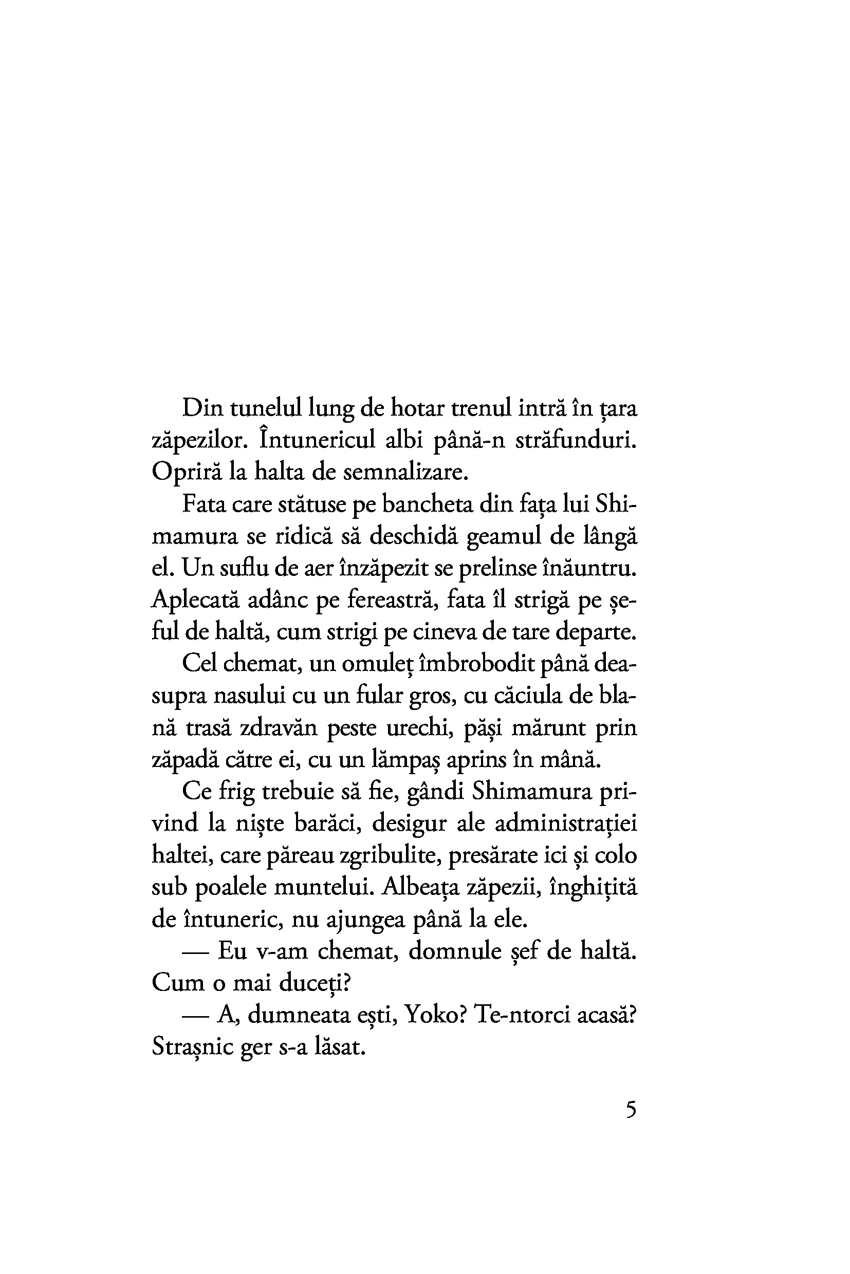 Shimamura are obiceiul de a se retrage iarna într-o micuță stațiune montană, lăsând în urmă agitația capitalei și viața de familie. Aici, în „țara zăpezilor“, o întâlnește pe tânăra gheișă Komako, a cărei franchețe deconcertantă este pe punctul de a-i tulbura bărbatului echilibrul. Oscilând între afecțiunea fățișă și necondiționată a gheișei și farmecul misterios al tăcutei Yoko, al cărei chip îl deslușește fugar, Shimamura este mereu un om al inacțiunii, iar pasivitatea lui o condamnă pe Komako să rămână prinsă fără scăpare în păienjenișul relațiilor și obligațiilor din țara zăpezilor.