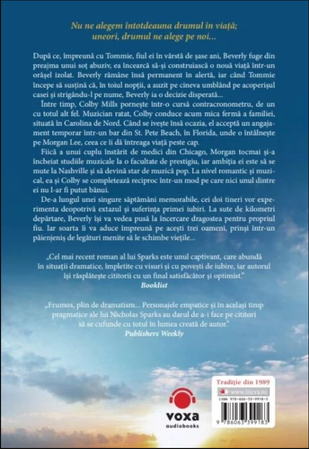 „Frumos, plin de dramatism... Personajele empatice și în același timp pragmatice ale lui Nicholas Sparks au darul de a-i face pe cititori să se cufunde cu totul în lumea creată de autor.” Publishers Weekly