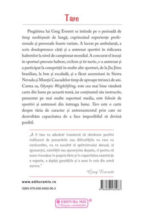 „Interesantă sincronicitatea lansării volumului Tare. Ne aflăm în mijlocul unei pandemii globale care ne-a schimbat viețile în moduri pe care puțini dintre noi și le-ar fi putut imagina cu câțiva ani în urmă. Iată de ce avem nevoie de tărie fizică, emoțională și mentală, aceasta fiind un instrument indispensabil pentru a merge înainte și a prospera, nu doar a supraviețui. Ideile profunde pe care ni le împărtășește Greg Everett în această carte, probate de-a lungul propriei pregătiri atletice, a activității de instructor și de antreprenoriat, transmit mesajul de care avem nevoie acum și în viitor.”