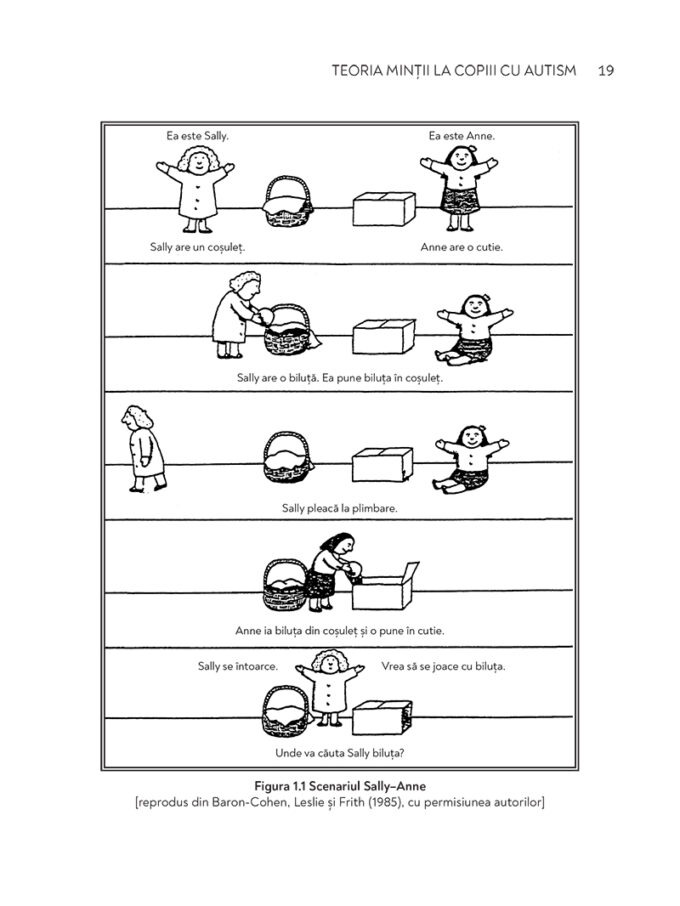 Copiii tipici și cei cu sindromul Down pricep rapid că prima păpușă nu știe ce s-a întâmplat în lipsa ei. În schimb, copiii cu autism spun că prima păpușă ar trebui să caute biluța în coșul celei de-a doua păpuși.
