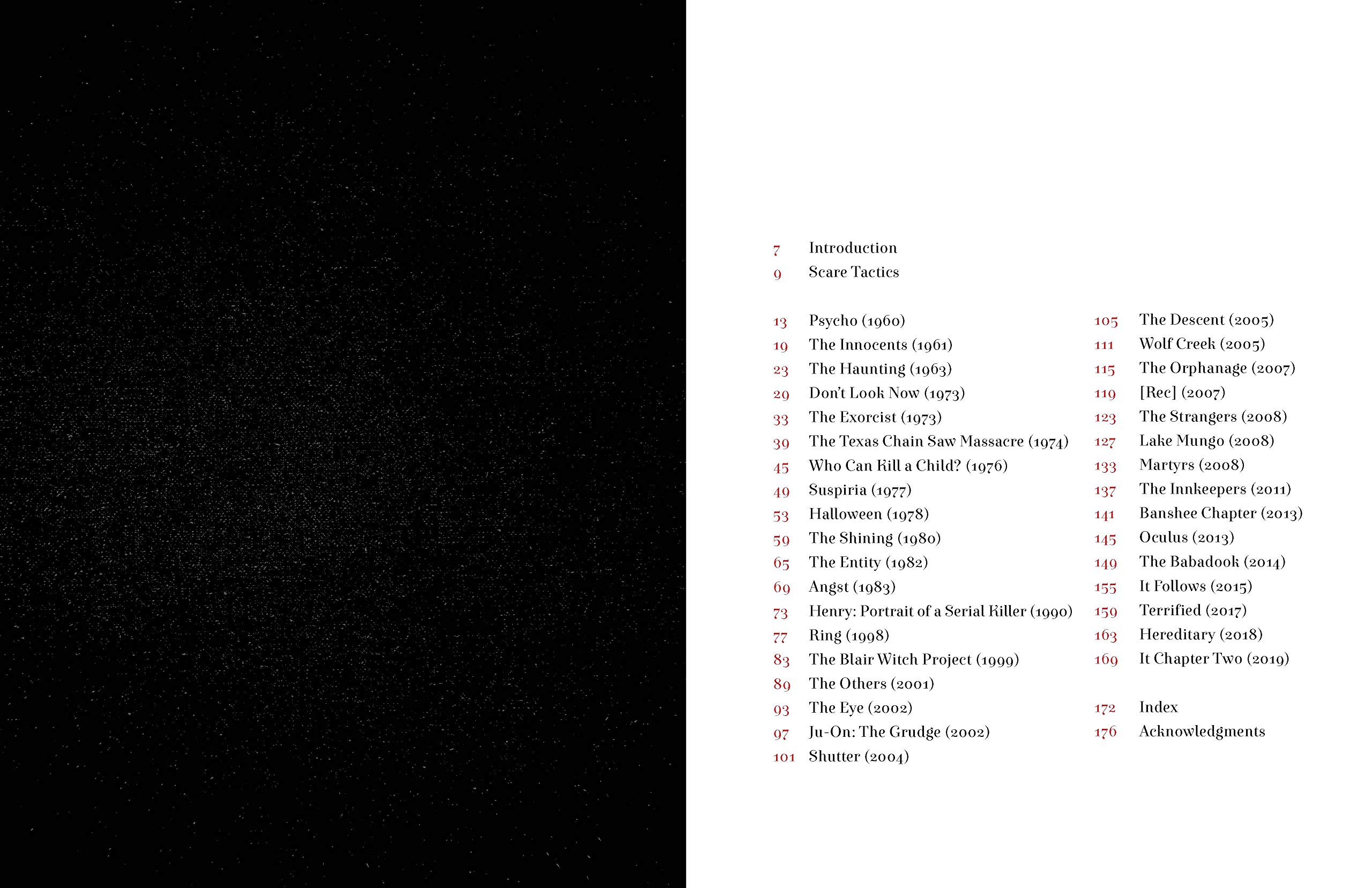 Psycho (1960), The Innocents (1961), The Haunting (1963), Don’t Look Now (1973), The Exorcist (1973), The Texas Chain Saw Massacre (1974), Who Can Kill a Child? (1976), Suspiria (1977), Halloween (1978), The Shining (1980), The Entity (1982), Angst (1983), Henry: Portrait of a Serial Killer (1990), Ring (1998), The Blair Witch Project (1999), The Others (2001), The Eye (2002), Ju-On: The Grudge (2002), Shutter (2004), The Descent (2005), Wolf Creek (2005), The Orphanage (2007), [Rec] (2007), The Strangers (2008), Lake Mungo (2008), Martyrs (2008), The Innkeepers (2011), Banshee Chapter (2013), Oculus (2013), The Babadook (2014), It Follows (2015), Terrified (2017), Hereditary (2018), It Chapter Two (2019)
