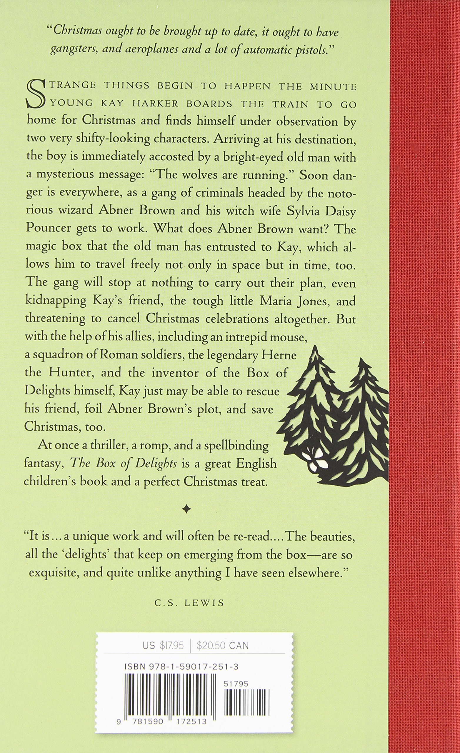 Strange things begin to happen the minute young Kay Harker boards the train to go home for Christmas and finds himself under observation by two very shifty-looking characters. Arriving at his destination, the boy is immediately accosted by a bright-eyed old man with a mysterious message: “The wolves are running.” Soon danger is everywhere, as a gang of criminals headed by the notorious wizard Abner Brown and his witch wife Sylvia Daisy Pouncer gets to work. What does Abner Brown want? The magic box that the old man has entrusted to Kay, which allows him to travel freely not only in space but in time, too. The gang will stop at nothing to carry out their plan, even kidnapping Kay’s friend, the tough little Maria Jones, and threatening to cancel Christmas celebrations altogether. But with the help of his allies, including an intrepid mouse, a squadron of Roman soldiers, the legendary Herne the Hunter, and the inventor of the Box of Delights himself, Kay just may be able rescue his friend, foil Abner Brown’s plot, and save Christmas, too.
